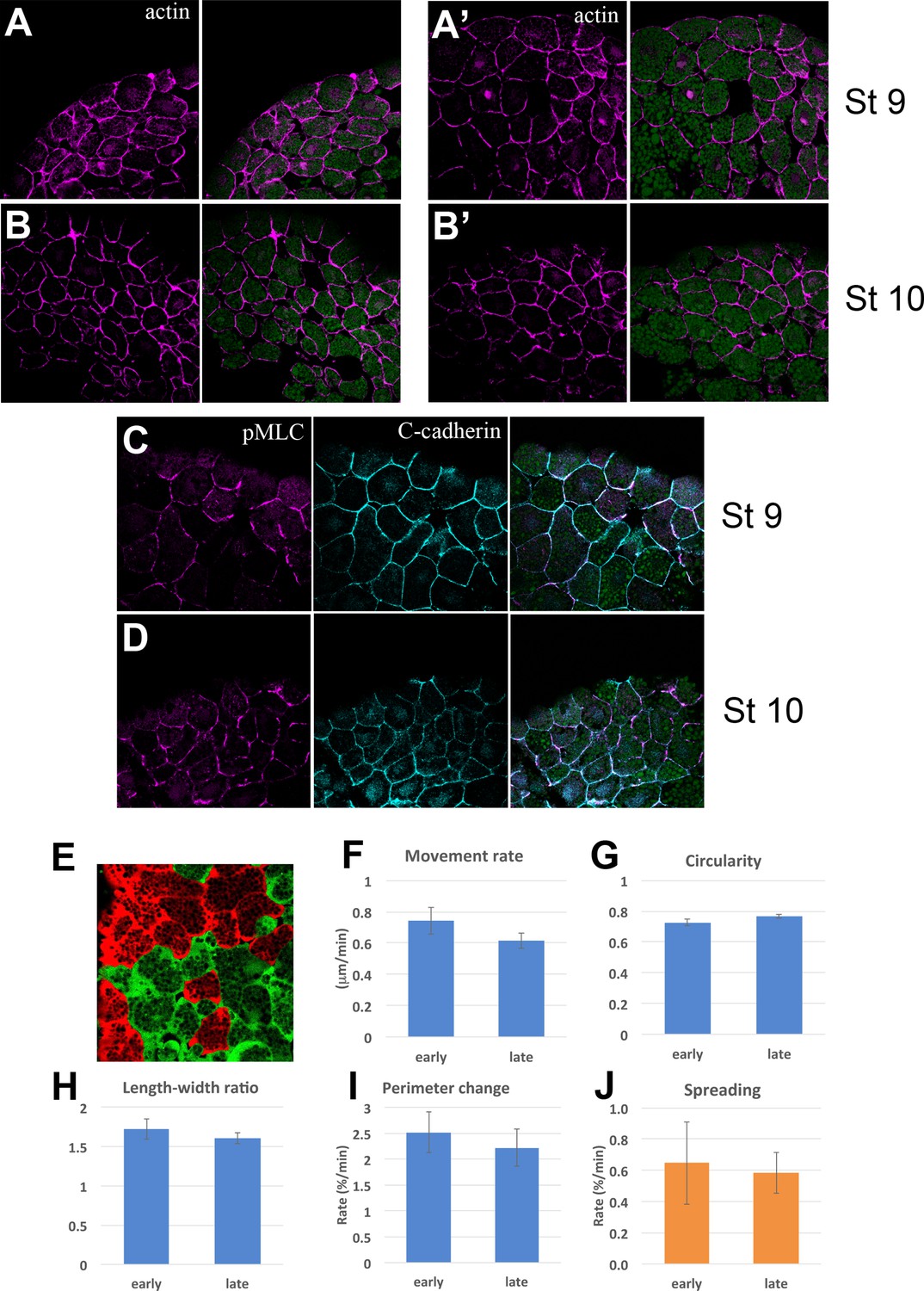 Figure 5-Figure Supplement 3. Cytoskeleton and Cell motility. Actin (magenta) and yolk autofluorescence (green) in the upper and lower IMZ at Stages 9 (A, Aâ) and 10 (B, Bâ); vegetal is to the left. Loose cell organization is a by-product of the rapid fixation used to allow Phalloidin staining. pMLC (magenta) and C-cadherin (cyan) in the upper IMZ at Stages 9 (C) and 10 (D). Fluorescently labeled cells in deep cell explants of upper IMZ were imaged via LSCM (Video 19) and their outlines and centroids were tracked and analyzed. Mean movement rate of the centroid over 2â3 min intervals (E), mean Circularity ( = 4Ï*(area)/(perimeter)^2, such that 1 = a perfect circle) (F), mean Aspect ratio (length:width ratio of an ellipse fit to the cell outline) (G), and mean Perimeter Length change (H) show no significant differences between Stages 9â9.5 (âearlyâ) and Stage 10 (âlateâ). Dissociated deep IMZ cells were plated on C-cadherin-Fc and imaged with DIC optics (Video 20) and their outline was tracked and analyzed at 5â16 min intervals. The rate of cell spreading was not significantly different at Stage 9â9.5 vs. Stage 10 (I). Error bars for E-I are standard error of the mean. |