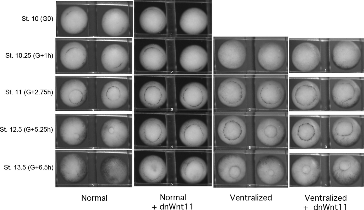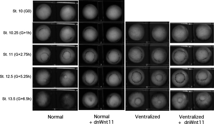 Figure 7-Figure Supplement 1. Time lapse movie stills of normal and ventralized embryos, +/- 0.5 ng dnWnt11 mRNA. dnWnt11 causes a delay in blastopore closure in normal, but not in ventralized embryos. |