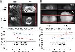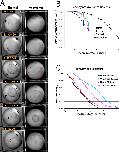 Figure 5—figure supplement 1. Example of parallel plate compression test.Frames taken at 0, 10, 180, and 220 seconds (A, B, C, D, respectively). Blue line marks the top of the explant prior to compression (0 s, A). Orange line marks top of explant after initial compression is applied (10 s, B). Red line marks top of explant after 180 s of stress relaxation (C). Green line marks top of explant 10 s after plate is lifted off explant (220 s, D). Compression is applied to 20% strain over the first 10 s, then stabilized for an additional 10 s, after which active plate movement stops and the explant is allowed to undergo stress relaxation (E). The shape of the explant profile is measured at 180 s (F), giving the radii of curvature and the angle between explant and plate (F – inset; R1–R3, A); these are used to give the surface tension (see Materials and methods). Figure 5—figure supplement 1F inset is reproduced from image from CellScale MicroTester software, with permission from CellScale. |