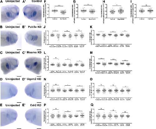FIGURE 3. Knockdown of Polr3e and Mosmo affect CNC migration in vivo. (AâC, Aâ²âC) (AâE, Aâ²âEâ²) Lateral views of stage 25 embryos following whole-mount in situ hybridization against twist. Each column of panels are lateral views of two sides of the same embryo. Embryos were unilaterally injected to KD each individual 16p12.1-affected gene in half of the embryo and the other half was left uninjected. The left panels (AâE) represent the uninjected side and the right panels (Aâ²âEâ²) represent the injected side. (FâQ) Measurements were taken for the total area of the three PAs (posterior PA, anterior PA, and hyoid PA), the length of each individual arch, and the NCC migration distance, as measured from the dorsal-most tip of each arch to the neural tube, by taking ratios of the injected side versus the uninjected side. Significance was determined using an unpaired students t-test with these ratios. (FâH) Partial depletion of both Polr3e and Mosmo significantly reduced the total area of the three PAs, while partial depletion of Uqcrc2 slightly increased the total area of the three PAs. (JâK) Polr3e KD significantly reduced the length of the posterior PA but had no effect on the length of the anterior PA or hyoid PA. However, partial depletion of this gene significantly reduced the total NCC migration distances for all three PAs. (LâM) Mosmo KD significantly reduced the length of the anterior PA and hyoid PA but had no effect on the length of the posterior PA. Partial depletion of this gene also significantly reduced the total NCC migration distance for all three PAs. (NâO) Uqcrc2 KD slightly increased the length of the anterior and hyoid PA but had no effect on the length of the posterior PA, nor did it affect the total NCC migration distance. (I, PâQ) Cdr2 KD had no effect on the total area of the three PAs, nor did it affect the total NCC migration distance. However, partial depletion of this gene slightly increased the length of the hyoid PA but did not affect the posterior or anterior PAs. (Embryos quantified: Control for Polr3e = 35, Control for Mosmo = 48, Control for Uqcrc2 = 48, Control for Cdr2 = 45, Polr3e KD = 41, Mosmo KD = 75, Uqcrc2 KD = 68, Cdr2 KD = 45). ****p < 0.0001, ***p < 0.001, **p < 0.01, *p < 0.05, n.s., not significant. Scalebar = 300 μm. |