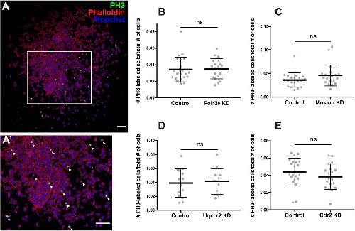 FIGURE 5. Manipulation of 16p12.1-affected genes does not impact NCC proliferation in vitro. Dissected NCC explants from control, Polr3e KD, Mosmo KD, Uqcrc2 KD, and Cdr2 KD embryos were plated on fibronectin-coated coverslips, allowed to adhere and begin migration for 4 h before being fixed in 4% PFA and immunostained with PH3 antibody as a marker for NCC proliferation, phalloidin to label the actin cytoskeleton, and Hoechst to label nuclei. (A,Aâ²) Representative image of control NCC explant immunostained with PH3, phalloidin, and Hoechst. White arrows denote cells positively labeled for PH3. (BâE) Quantification of the number of positively PH3-labeled cells versus the total number of cells per NCC explant for Polr3e KD, Mosmo KD, Uqcrc2 KD, and Cdr2 KD compared to controls. Partial depletion of each individual 16p12.1-affected did not have a significant impact on NCC proliferation in vitro. (Explants quantified: 6-7 explants from control and KD embryos were plated for each experiment. Three separate experiments were performed for each depletion). ****p < 0.0001, ***p < 0.001, **p < 0.01, *p < 0.05, n.s., not significant. Scalebar = 300 μm. |