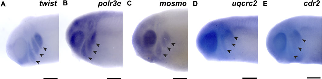 FIGURE 1. 16p12.1-affected genes are expressed in migrating neural crest cells during embryonic development. (A) Lateral view of whole-mount in situ hybridization at stage 25 for twist, a NCC-enriched transcription factor. Anterior of embryo is to left. Arrows indicate the pharyngeal arches (PAs). (BâE) In situ hybridization at stage 25â28 for polr3e, mosmo, uqcrc2, and cdr2 demonstrate expression in NCCs that occupy the PAs (n = 10 per probe). Scalebar = 300 μm. |