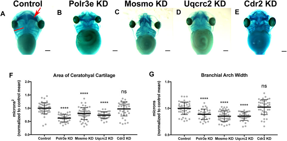 FIGURE 2. Knockdown of Polr3e, Mosmo, and Uqcrc2 impact cartilage morphology. (AâE) Ventral view of stage 42 embryos following single 16p12.1-associated gene KD, stained with Alcian blue to label cartilage elements. Anterior of embryo is at the top. In the control, the red arrow points to ceratohyal cartilage, while the red bar spans the first branchial arch. (FâG) Measurements of the average ceratohyal area and width of the first branchial arch. The data was normalized to the control MO condition. Partial depletion of Polr3e, Mosmo, and Uqcrc2 significantly reduced the size of both of these cartilage elements compared to controls, while depletion of Cdr2 had no effect on cartilage size. Significance determined using a studentâs unpaired t-test. (Embryos quantified: Control = 48, Polr3e KD = 32, Mosmo KD = 51, Uqcrc2 KD = 34, Cdr2 KD = 39). ****p < 0.0001, ***p < 0.001, **p < 0.01, *p < 0.05, n.s., not significant. Scalebar = 300 μm. |