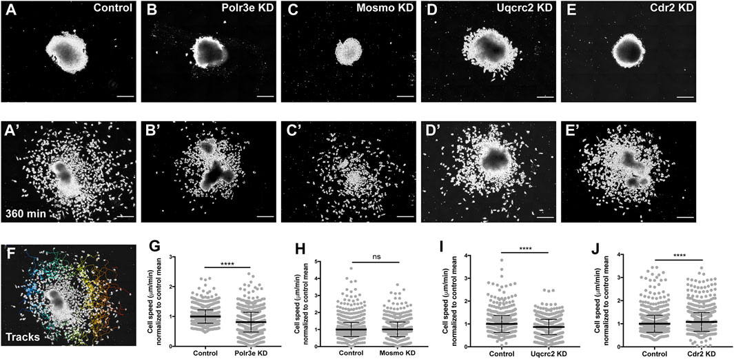 FIGURE 4. Manipulation of Polr3e, Uqcrc2, and Cdr2 impacts NCC migration speeds in vitro. Dissected NCC explants from control, Polr3e KD, Mosmo KD, Uqcrc2 KD, or Cdr2 KD embryos were plated on fibronectin-coated coverslips, allowed to adhere and begin migration, and imaged for 6 h using 20x phase microscopy. (AâE) Representative images of explants at initial timepoint (0 min). (Aâ²âEâ²) Representative images of explants after 6 h migration (360 min). (F) Representative tracks generated by FiJi Trackmate plug-in overlaid on panel Aâ. (GâJ) Mean track speeds of Polr3e KD, Mosmo KD, Uqcrc2 KD, and Cdr2 KD explants compared to their controls. Partial depletion of Polr3e and Uqcrc2 significantly reduced mean NCC speed, while depletion of Cdr2 increased mean NCC speed. Partial depletion of Mosmo had no effect on mean NCC speed. (Explants quantified: 6-7 explants from control and KD embryos were plated for each experiment. Three separate experiments were performed for each depletion.) ****p < 0.0001, ***p < 0.001, **p < 0.01, *p < 0.05, n.s., not significant. Scalebar = 200 μm. |