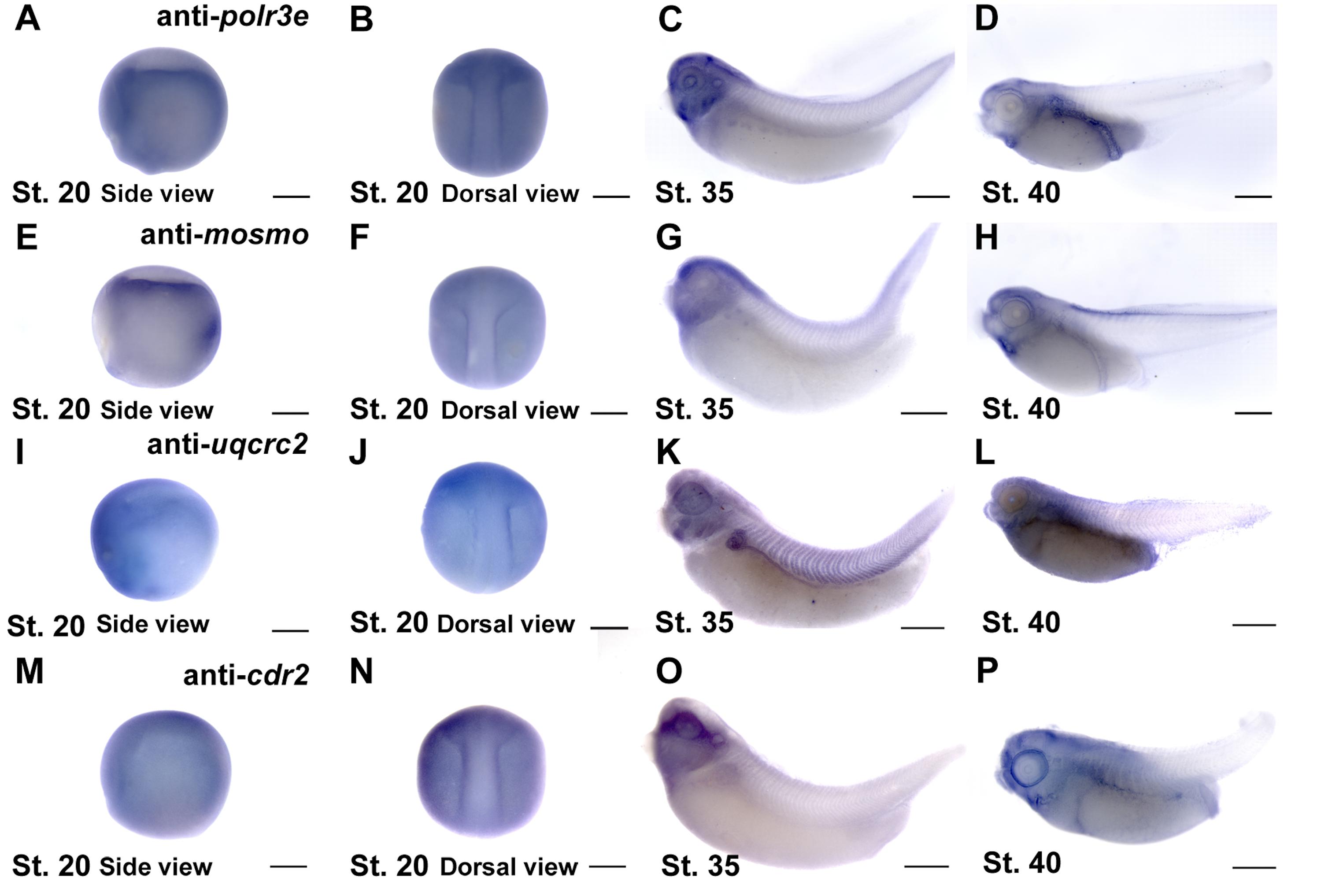 Figure S3: Expression patterns for 16p12.1-affected genes across early development. In situ hybridization utilized (A-D) antisense mRNA probe to polr3e, (E-H) antisense mRNA probe to mosmo, (I-L) antisense mRNA probe to uqcrc2, and (M-P) antisense mRNA probe to cdr2. Anterior to the left. Lateral and dorsal view images of embryos shown at stage 20 (A-B, E-F, I- J, M-N), lateral view at stage 35 (C, G, K, O), and lateral view at stage 40 (D, H, L, P) (n = 10 per probe) Scalebar = 300μm. |