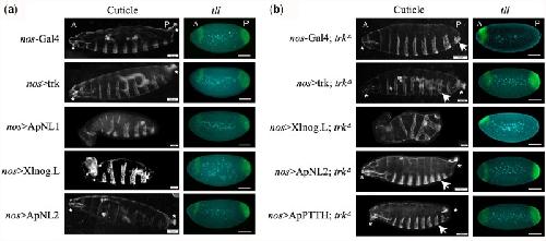 Fig. 3. ApNL2 rescues trkΔ mutant phenotypes while Xlnog.L ventralizes Drosophila embryos. a) Maternal expression of genes expressed via the nanos (nos) promoter during Drosophila embryo patterning. Wild-type control (nos-Gal4) first instar larvae cuticle shows normal terminal structures and normal tailless (tll) expression in stage 4 embryos. b) Maternal expression of genes in trunk null mutant flies during Drosophila terminal patterning. The trunk null mutant (nos-Gal4; trkΔ) cuticle lacks abdominal segment after A7 (arrowed) and posterior tll expression in stage 4 embryos. DAPI—staining in centre of embryos, tll—staining at the terminal ends of the embryos. A, anterior; P, posterior. Anterior mouth-hooks and posterior filzkörper are marked by asterisks. Scale bar 100 µm or otherwise stated.