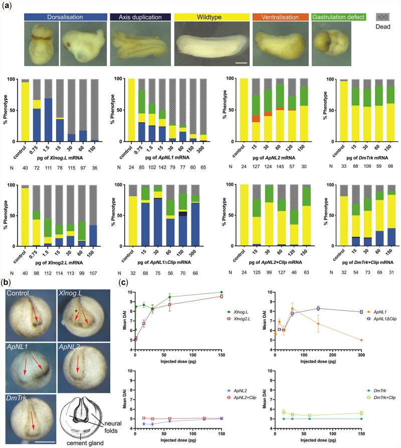 Fig. 1. ApNL1 induces dorsalization in Xenopus embryos. a) Phenotypes observed at stage 32 Xenopus embryos for microinjections of Xlnog.L, Xlnog2.L, ApNL1, ApNL1ΔClip, ApNL2, ApNL2+Clip, DmTrk, and DmTrk+Clip. Controls were injected with dH2O. N- total Xenopus embryos injected. b) Anterior view of stage 16 Xenopus embryos show presence/absence of axis duplication. c) Mean DAI charts for the microinjections of Xlnog.L, Xlnog2.L, ApNL1, ApNL1ΔClip, ApNL2, ApNL2+Clip, DmTrk, and DmTrk+Clip. Error bars denote SEM. DAI <5—ventralization; DAI 5- wild type: DAI >5—dorsalization. See also Supplementary Fig. 2. Scale bar 1 mm.