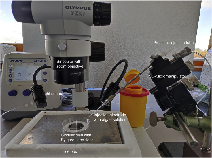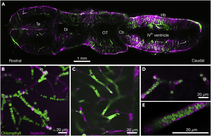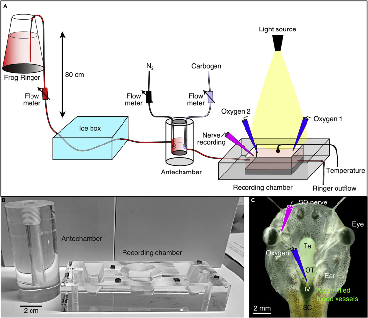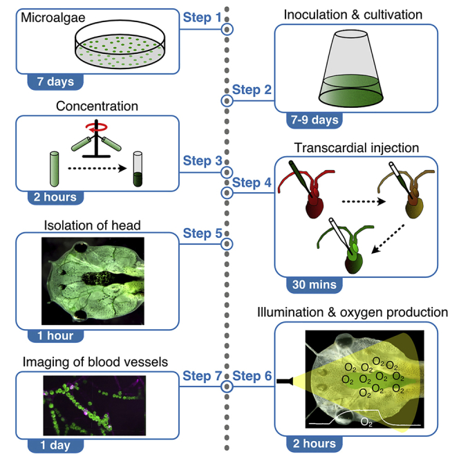 Oxygen in vertebrates is generally provided through respiratory organs and blood vessels. This protocol describes transcardial injection, vascular distribution, and accumulation of phototrophic microalgae in the brain of Xenopus laevis tadpoles. Following tissue isolation, oxygen dynamics and neuronal activity are recorded in semi-intact whole-head preparations. Illumination of such microalgae-filled preparations triggers the photosynthetic production of oxygen in the brain that, under hypoxic conditions, rescues neuronal activity. This technology is potentially able to ameliorate consequences of hypoxia under pathological conditions. For complete details on the use and execution of this protocol, please refer to Özugur et al. (2021).