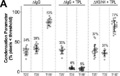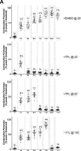 Figure 4—figure supplement 1 Condensation parameters of condensation kinetics after DMSO or Triptolide treatment. (A) Scatter plots of the percentage of pixels below a threshold of 35% of image maximum fluorescence intensity (the condensation parameter), for each drug condition and indicated time point. Error bars represent SD, and the mean values are indicated. n = 20 structures for each condition. Two biological replicates were performed, quantified structures are from a single experiment. |