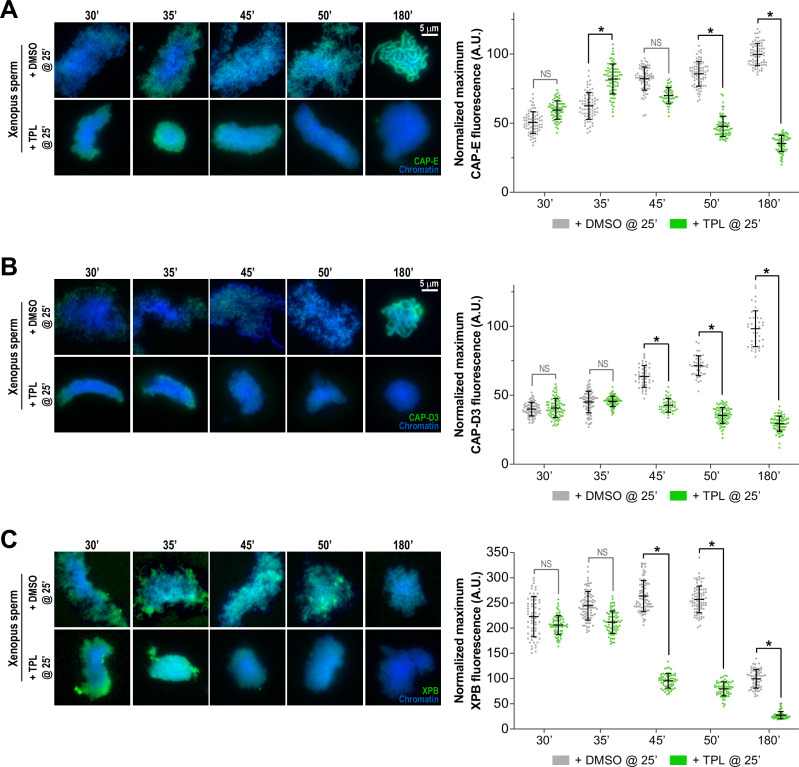 Figure 4—figure supplement 2. Triptolide perturbs condensation prior to its effects on condensin levels.(A) Left: Representative immunofluorescence images of DMSO or triptolide-treated extracts at indicated timepoints. Chromatids were labeled with DAPI and anti-CAP-E (condensin I & II). Right: Quantification of fluorescence intensity of CAP-E, normalized to the 180 min DMSO-treated sample. This data is also shown in Figure 4B in grayscale. (B) Left: Representative immunofluorescence images of DMSO or triptolide treated extracts at indicated timepoints. Chromatids were labeled with DAPI and anti-CAP-D3 (condensin II). Right: Quantification of fluorescence intensity of CAP-D3, normalized to the 180 min DMSO-treated sample. (C) Left: Representative immunofluorescence images of DMSO or triptolide treated extracts at indicated timepoints. Chromatids were labeled with DAPI and anti-XPB (TFIIH complex). Right: Quantification of fluorescence intensity of XPB, normalized to the 180 min DMSO-treated sample. n = 50 structures for each condition. Error bars represent SD, and asterisks indicate a statistically significant difference (*, p < 0.001). A.U., arbitrary units. Two biological replicates were performed, quantified structures are from a single experiment. |