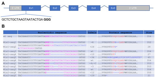 Figure 1. Genomic analysis of X. tropicalis rho crispants. (A) Schematic of the Xenopus tropicalis rho gene. The depicted sequence corresponds to the CRISPR RNA targeting exon 1 and to the protospacer adjacent motif (PAM; indicated in bold). (B) Sequences obtained from individual clones of PCR products amplified from genomic DNA. Two mixtures (Mix1, 2) of 5 X. tropicalis F0 embryos injected with 500 pg of rho sgRNA and 600 pg of cas9 mRNA were used. For each clone, the targeted sequence is shown in pink, with PAM in bold, while indels are in blue. The right column indicates the corresponding protein sequence and its size (number of amino acids). |