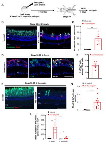 Figure 6. Analysis of proliferation in X. tropicalis and X. laevis rho crispants. (A) Timeline diagram of the experimental procedure used in (B–H). (B,C) BrdU assay on retinal sections from stage 56–60 control and crispant X. laevis tadpoles. Sections were co-labelled for Rhodopsin. Arrows point to double positive cells. BrdU-positive cells are quantified in (C). (D) Typical sections from stage 56–60 crispant X. laevis tadpoles, immunostained for PCNA (a marker of proliferative cells) and YAP (a marker of Müller cells). Arrows point to double positive cells. (E) Quantification of proliferating Müller cells (YAP- and PCNA-positive). (F,G) BrdU assay on retinal sections from stage 56–60 control and crispant X. tropicalis tadpoles. Sections were co-labelled for Rhodopsin. BrdU-positive cells are quantified in (G). (H) Comparison of BrdU incorporation between X. laevis and X. tropicalis crispants at stage 56–60. The number of BrdU-positive cells was normalized to retinal cell surface. In (B,D,F) cell nuclei are counterstained with Hoechst (blue). In (C,G), counting was performed in the central retina, considering only the inner and outer nuclear layers. In graphs, data are represented as mean ± SEM and each point represents one retina. * p < 0.05; ** p < 0.01; **** p < 0.0001 (Mann–Whitney tests). GCL: ganglion cell layer, INL: inner nuclear layer, ONL: outer nuclear layer. Scale bars: 50 µm in (B,F), 25 µm in (D).
