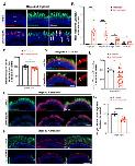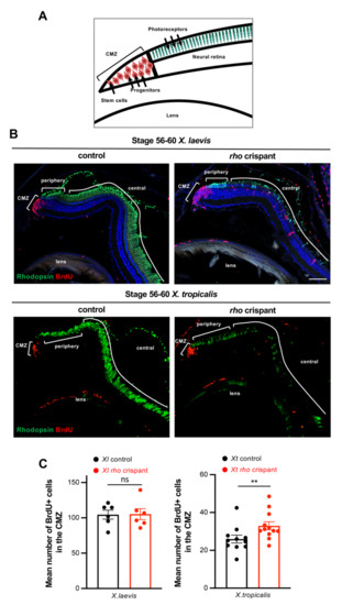 Figure 7. Analysis of proliferative CMZ cells in X. tropicalis and X. laevis rho crispants. (A) Schematic representation of the peripheral part of the retina. Stem cells and progenitors lie at the tip within the ciliary marginal zone (CMZ), while newly produced differentiated cells are found more centrally (only photoreceptors are shown here). (B) Typical retinal sections from stage 60 control and crispant X. laevis and X. tropicalis tadpoles, immunostained for Rhodopsin and BrdU (protocol illustrated in the timeline diagram of Figure 6A). Cell nuclei are counterstained with Hoechst (blue). (C) Quantification of BrdU-labelled cells in the CMZ. In graphs, data are represented as mean ± SEM, and each point represents one retina. ** p < 0.01; ns: non-significant (Mann–Whitney tests). Scale bar: 50 µm. |