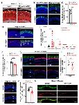 Figure 3. Rod cell death and cone defects in X. tropicalis rho crispants. (A) Typical retinal sections from stage 40 control and crispant X. tropicalis embryos, immunostained for cleaved Caspase 3 and Rhodopsin. Arrows point to double positive cells. (B) Quantification of Caspase 3-positive cells from stage 40 to stage 47. (C) Quantification of ONL nuclei on retinal sections from stage 45/47 control and crispant X. tropicalis tadpoles. Nuclei were counted in one standard square field per section. (D,E) Immunofluorescence analysis of Recoverin expression on retinal sections from stage 45 control and crispant X. tropicalis tadpoles. Sections were co-stained for Rhodopsin for comparison. Panels on the right show the regions delineated with the dotted white boxes and highlight the decreased thickness of Recoverin staining in crispants (brackets). The total area of Recoverin staining is quantified in (E). (F) Typical retinal sections from stage 47 control and crispant X. tropicalis tadpoles, immunostained for Rhodopsin and Calbindin (a marker of cone photoreceptors). (G) Quantification of cone outer segment length. (H) Retinal sections from stage 53 control and crispant X. tropicalis tadpoles, immunostained for Rhodopsin and S/M-opsin (a marker of cone photoreceptors). Note the continuous but thinner staining in the outer nuclear layer of crispant tadpoles. In (A,D,F,H), cell nuclei are counterstained with Hoechst (blue). In graphs, data are represented as mean ± SEM, and each point represents one retina. * p < 0.05; ** p < 0.01; *** p < 0.001 (Mann–Whitney tests). Scale bar: 25 µm in (A,D) and 50 µm in (F,H). |