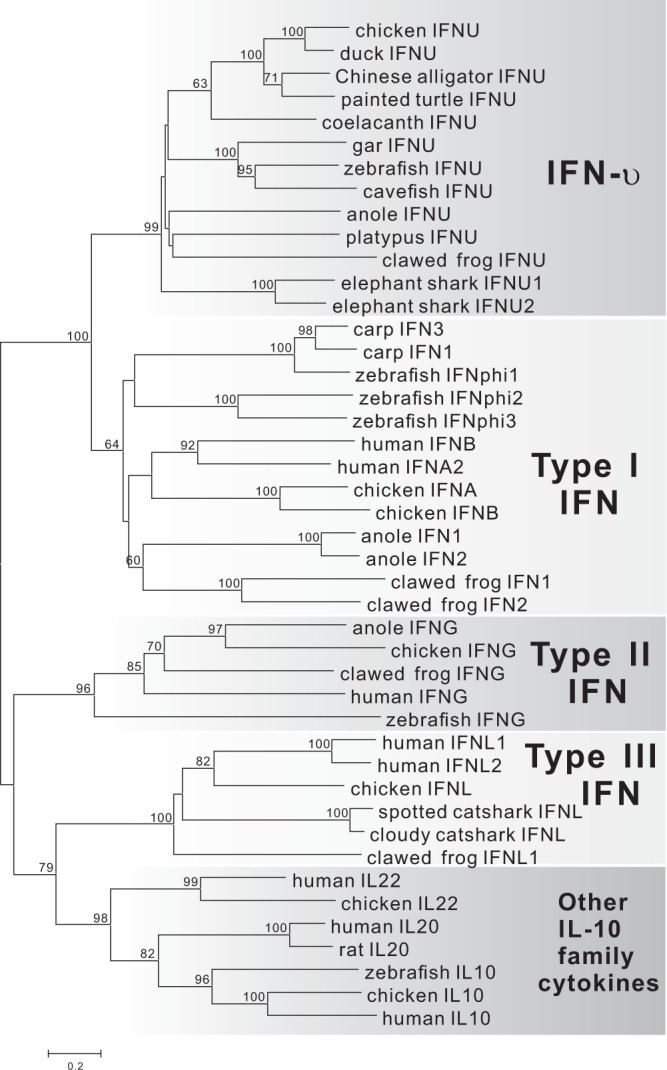 Interferons (IFNs) are critical soluble factors in the immune system and are composed of three types, (I, II and III) that utilize different receptor complexes IFN-αR1/IFN-αR2, IFN-γR1/IFN-γR2, and IFN-λR1/IL-10R2, respectively. Here we identify IFN-υ from the genomic sequences of vertebrates. The members of class II cytokine receptors, IFN-υR1 and IL-10R2, are identified as the receptor complex of IFN-υ, and are associated with IFN-υ stimulated gene expression and antiviral activity in zebrafish (Danio rerio) and African clawed frog (Xenopus laevis). IFN-υ and IFN-υR1 are separately located at unique and highly conserved loci, being distinct from all other three-type IFNs. IFN-υ and IFN-υR1 are phylogenetically clustered with class II cytokines and class II cytokine receptors, respectively. Therefore, the finding of this IFN ligand-receptor system may be considered as a type IV IFN, in addition to the currently recognized three types of IFNs in vertebrates.