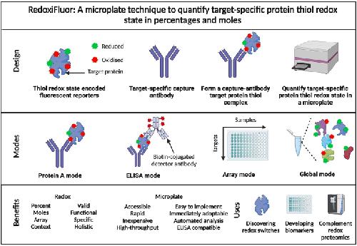 Fig. 1. RedoxiFluor overview. Design. RedoxiFluor uses two spectrally distinct thiol-reactive fluorescent reporters to encode target-specific redox state. For example, reduced and reversibly oxidised thiols are labelled with green and red thiol-reactive fluorophores, respectively (see main text). A target-specific capture antibody immobilised in a microplate is used to selectively bind the target from a sample. Target-specific redox state can be quantified in relative percentage and molar terms in a microplate. Modes. RedoxiFluor can operate in protein A (percentages), ELISA (percentages and moles), array, and global (context) mode. Key redox and microplate related benefits of RedoxiFluor are shown. Key RedoxiFluor uses are illustrated. (For interpretation of the references to colour in this figure legend, the reader is referred to the Web version of this article.) |
