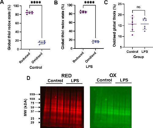 Fig. 3. No difference in the redox state of the bulk thiol proteome in unstimulated (control) and LPS-stimulated human monocytes. Significant differences (paired t-tests, P = < 0.0001 in panels A–B, n = 6) in percent reduced compared to percent oxidised protein in unstimulated (control, panel A) and LPS-stimulated (panel B) human monocytes. C. No significant difference (unpaired t-test, P = 0.9694, n = 6) in percent reversibly oxidised protein in LPS-stimulated human monocytes compared to unstimulated human monocytes. D. A representative SDS-PAGE gel image showing that both proteomes are highly reduced and similar band patterns in the reduced (red channel, F-MAL1) and reversibly oxidised (green channel, F-MAL2) channels in control and LPS samples. Data are presented as the mean (M) and standard deviation (SD). (For interpretation of the references to colour in this figure legend, the reader is referred to the Web version of this article.) |