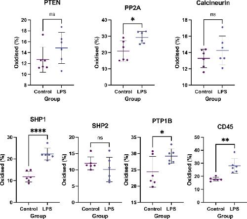 Fig. 5. LPS increases PP2A-, PTP1B-, SHP1-, and CD45-specific reversible thiol oxidation. No significant difference (all unpaired t-tests and n = 6) in PTEN (P = 0.1871), SHP2 (P = 0.3054), and calcineurin (P = 0.2780) specific reversible thiol oxidation (i.e., percent oxidised protein) in unstimulated (control) and LPS-stimulated human monocytes as determined by array mode RedoxiFluor. A significant (all unpaired-tests and n = 6) LPS-induced increases in PP2A (P = 0.0181), SHP1 (P < 0.0001), PTP1B (P = 0.0483), and CD45 (P = 0.0018) specific reversible thiol oxidation occurred in LPS-stimulated human monocytes compared to unstimulated controls. Data are presented as the mean (M) and standard deviation (SD). |