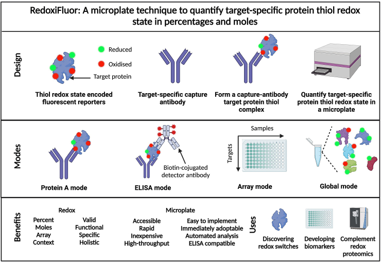 Fig. 1. RedoxiFluor overview. Design. RedoxiFluor uses two spectrally distinct thiol-reactive fluorescent reporters to encode target-specific redox state. For example, reduced and reversibly oxidised thiols are labelled with green and red thiol-reactive fluorophores, respectively (see main text). A target-specific capture antibody immobilised in a microplate is used to selectively bind the target from a sample. Target-specific redox state can be quantified in relative percentage and molar terms in a microplate. Modes. RedoxiFluor can operate in protein A (percentages), ELISA (percentages and moles), array, and global (context) mode. Key redox and microplate related benefits of RedoxiFluor are shown. Key RedoxiFluor uses are illustrated. (For interpretation of the references to colour in this figure legend, the reader is referred to the Web version of this article.) |