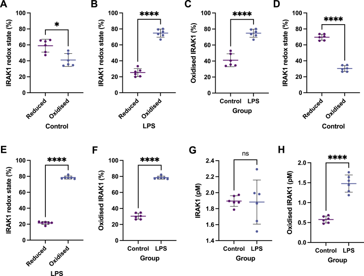 Fig. 4. LPS increases IRAK1-specific reversible thiol oxidation. A. In protein A mode, precent reduced is significantly (paired t-test, P = 0.0419, n = 6) greater than percent oxidised IRAK1 in unstimulated (control) human monocytes. B. In protein A mode, precent oxidised is significantly (paired t-test, P = < 0.0001, n = 6) greater than percent reduced IRAK1 in LPS-stimulated human monocytes. C. Protein A mode RedoxiFluor revealed a significant (unpaired t-test, P = < 0.0001, n = 6) LPS-induced increase in percent oxidised IRAK1 in LPS stimulated compared to unstimulated cells. D. In ELISA mode, precent reduced is significantly (paired t-test, < 0.0001, n = 6) greater than percent oxidised IRAK1 in unstimulated monocytes. E. In ELISA mode, precent oxidised is significantly (paired t-test, P = < 0.0001, n = 6) greater than percent reduced IRAK1 in LPS-stimulated human monocytes. F. ELISA mode RedoxiFluor revealed a significant (unpaired t-test, P = < 0.0001, n = 6) LPS-induced increase in oxidised IRAK1 in LPS-stimulated monocytes compared to unstimulated monocytes. G. No significant difference (unpaired t-test, P = 0.9159, n = 6) in picomoles of IRAK1 in unstimulated monocytes compared to LPS-stimulated monocytes. H. A significant (unpaired t-test, P = < 0.0001, n = 6) LPS-induced increase in picomoles of oxidised IRAK1 in LPS-stimulated human monocytes compared to unstimulated human monocytes. Data are presented as the mean (M) and standard deviation (SD). |