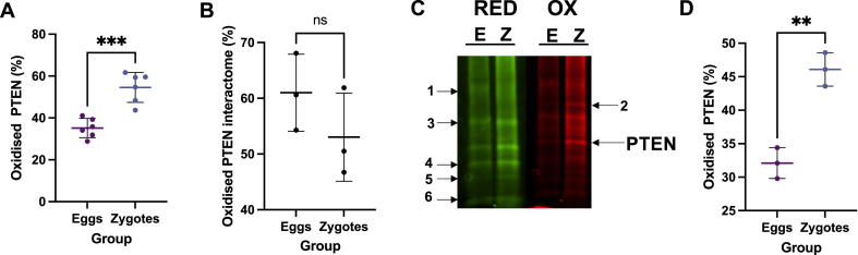 Fig. 6. Fertilisation increases PTEN-specific reversible thiol oxidation. A. Protein A mode RedoxiFluor revealed a significant (unpaired t-test, P = 0.0002, n = 6) fertilisation-induced increase in PTEN-specific reversible thiol oxidation in 1-cell zygotes compared to unfertilised eggs in X. laevis. B. Macroscale RedoxiFluor found no significant (unpaired t-test, P = 0.2592, n = 3) difference in PTEN interactome redox state in 1-cell zygotes compared to unfertilised eggs in X. laevis. C. A representative SDS-PAGE gel image showing the PTEN (highlighted) and the redox state (reduced = green channel; oxidised = red channel) of its interactome (arrows 1–6 correspond to coeluting proteins with molecular weights of ∼100, 75, 60, 37, 25 and 10 kDa, respectively) in unfertilised eggs (E) and zygotes (Z). D. Quantifying the redox state of the PTEN-specific band manually excised and eluted from (C) in unfertilised eggs and 1-cell zygotes in X. laevis confirmed the significant (unpaired t-test, P = 0.0020, n = 3) fertilisation-induced increase in PTEN-specific reversible thiol oxidation. Data are presented as the mean (M) and standard deviation (SD). (For interpretation of the references to colour in this figure legend, the reader is referred to the Web version of this article.) |