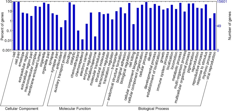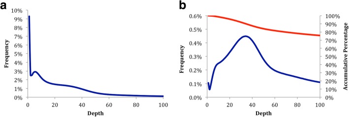 Fig. 1. Kmer (k = 17) frequency analysis. a Kmer species frequency graph. The horizontal axis shows the depth of kmer species, and the vertical axis shows the percentage of each kmer species value (blue curve). b. Kmer individuals frequency graph. The horizontal axis shows depth of kmer individuals, the left vertical axis shows the percentage of each kmer individual’s value (blue curve), and the right vertical axis shows the accumulative frequency of the kmer individuals (red curve)