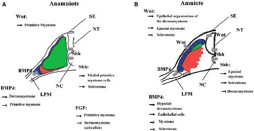 FIGURE 7. Main functions of BMP, FGF, Wnt, and Shh signalings during somite compartmentalization in anamniotes (A) and amniotes (B). Somite compartmentalization depends on signals expressed by surrounding tissues. Shh is expressed by notochord (NC) and floor plate, Wnt by surface ectoderm (SE) and dorsal neural tube (NT) and BMP4 by lateral plate mesoderm (LPM). Most of the functions fulfilled by the signaling molecules seem to be conserved between anamniotes (A) and amniotes (B). However, it seems that Fgf and to a lesser extent Wnt may play an early role in the formation of primitive myotome only in anamniotes (A). Arrows, promoting effect; T-shaped line, inhibitory effect. |