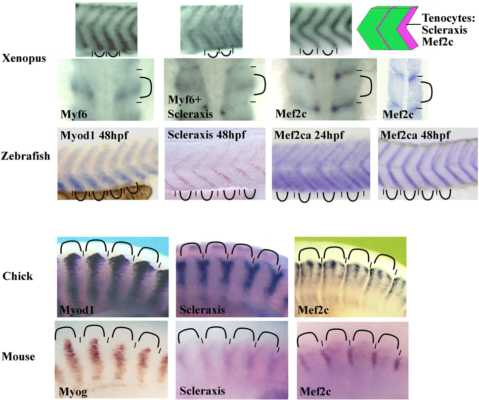 FIGURE 5. Comparison of the somitic Mef2c mRNA expression between zebrafish, Xenopus, chick, and mouse. The Mef2c expression is conserved in vertebrate somites. The staining is intense in intersomitic region corresponding to the syndetome where the tenocytes differentiate (schematic on the top right corner). In chick, the staining is reduced to muscle-associated tissue. The Mef2c expression is compared with both Scleraxis (syndetome marker) and Myod1, Myf6, or Myogenin (myotome markers). The somitic blocks are indicated by curved lines and the intersomitic regions by short lines. For zebrafish, the Mef2ca expression at 24 and 48 hpf (hours post fertilization). The probe is indicated in each image. All images are lateral views except the second row for Xenopus where the first three images at the left are dorsal views and the forth image at the right is a front view. Figure is composed of images from ISH database of ZFIN for zebrafish (zfin.org), Geisha for chick (geisha.arizona.edu) and Embrys for mouse (embrys.jp). |