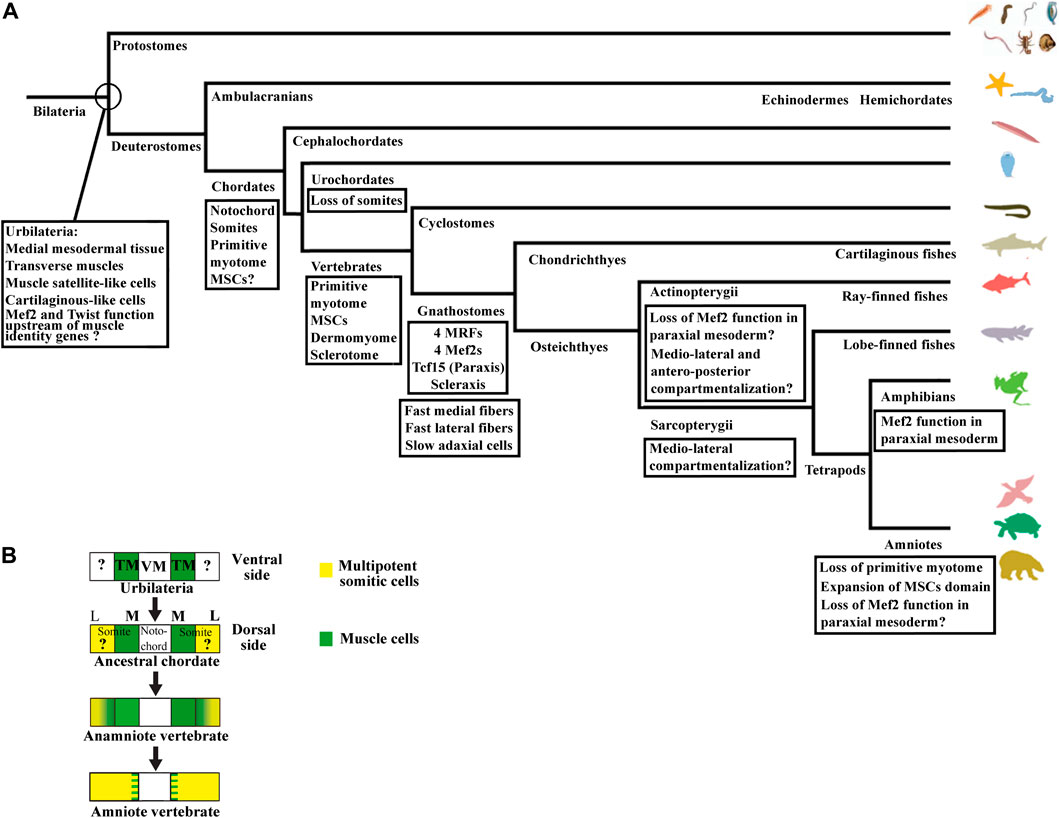 FIGURE 8. (A) Summary of the main changes during the evolutionary history of somites compartmentalization. The last common ancestor of bilaterians, Urbilateria, possesses neither somites nor notochord, but probably transverse muscles and a medial mesodermal tissue according to the axochord hypothesis (Brunnet al, 2015; Yasuoka, 2020). Satellite-like cells and cartilage-like cells are also probably already present in Urbilateria. Regarding the transcription factors expressed in vertebrate somites, results from Drosophila and Xenopus suggest that Mef2 and Twist could act upstream of muscle identity genes in Urbilateria. The notochord and the somites appear in chordates. The somite is made up of the primitive myotome and probably multipotent progenitors which give rise to satellite cells and muscle-associated tissues ventrally and dorsally. The existence of sclerotome-like cells in cephalochordates suggests that the somitic progenitors can already give rise to specialized connective tissue cells. In vertebrate, the somites compartmentalize mainly into the myotome, the dermomyotome, and the sclerotome. In gnathostome vertebrates, the three populations of slow, lateral fast, and medial fast muscle fibers has been characterized. The genome possesses both Scleraxis and Tcf15 genes, but also four MRFs and four Mef2 genes. The non-conservation of Mef2 function in the paraxial mesoderm and the changes in compartmentalization mode between zebrafish and Xenopus raise the question of the origin of these variations. (B) Evolution of somite compartmentalization based on axochord hypothesis (Brunet et al., 2015; Yasuoka, 2020). The axochord hypothesis (the axochord in annelids and the notochord in chordate are homologs) proposes that the notochord evolves from a medial mesodermal tissue present in Urbilateria, the last common ancestor of all bilaterians, and suggests that transverse muscles attached to it, could give rise to the primitive myotome in ancestral chordates. The origin of MSCs in Urbilateria is unknown. Proto-MSCs probably already exist in last chordate ancestor. The transition from ancestral chordates to vertebrates allowed MSCs to give rise to all new somite structures, i.e., the dermomyotome, its hypaxial region, and the sclerotome. The transition from anamniote to amniote vertebrates is characterized by expansion of the MSCs domain at the expense of the primitive myotome. The chordate dorso-ventral axis is inverted compared with Urbilateria. Anamniote vertebrate is used in Figure 8B as the somite organization of the extant anamniote vertebrates are considered to be closed to the primitive one. VM, ventro-medial mesodermal tissue; TM, transverse muscle; M, medial somite region; L, lateral somite region. |