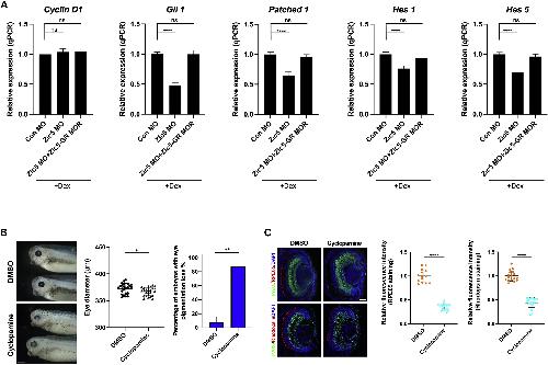 Figure S4. Related to Figure 3. The expression of Hes1 and Hes5 but not Zic5 was regulated by Hh signal in the developing eyes. (A) Embryos were treated with DMSO or cyclopamine from stage 18-19. 40 eyes per group were then dissected at stage 38 for quantitative PCR analysis. Quantification of normalized fold expression of indicated genes with unpaired t test, ****, P < 0.0001. Histograms represent means ± s.d. (B) Embryos were treated with DMSO or cyclopamine or purmorphamine from stage 18-19. 40 eyes per group were then dissected at stage 38 for quantitative PCR analysis. Quantification of normalized fold expression of indicated genes with one-way ANOVA (Dunnettâs multiple comparisons test), ****, P < 0.0001. Histograms represent means ± s.d. ns: no statistical differences between the groups. |