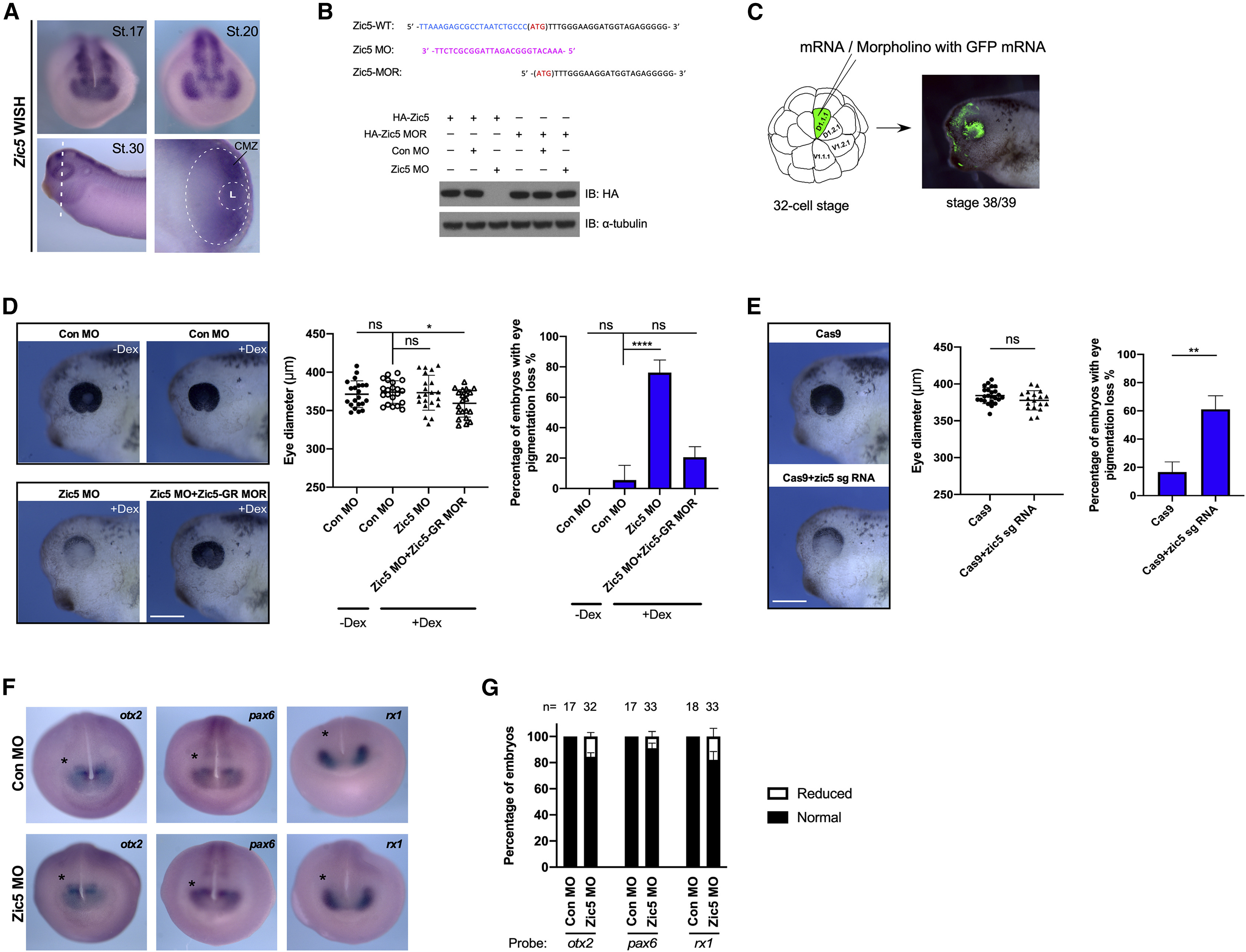 Figure 1. Zic5 is required for normal eye development in Xenopus (A) Whole-mount in situ hybridization with Xenopus Laevis Zic5 probe at indicated stages. The white, dotted oval outlines the retina. The smaller dotted circle outlines the lens. L, Lens. (B) Zic5 MO efficiently blocks exogenous Zic5-WT expression, while the injection of the MO-resistant mutant (Zic5-MOR) mRNA is not affected by the MO. Above the blot is a depiction of the wild-type Zic5 nucleotide sequence near the ATG start codon, the Zic5 MO sequence, and the MO-resistant mRNA sequence. (C) Scheme for microinjection into the D.1.1.1 blastomere at the 32-cell stage. The D.1.1.1 blastomere is a major contributor to retina and the lineage (green) can be traced at tadpole stages. (D) Knockdown of Zic5 causes pigmentation loss in the eye. Eye diameter was quantified with one-way ANOVA (Dunnett's multiple comparisons test). Scatterplots represent means ± SD from three biological repeats, ns: no statistical differences between the groups. Scale bar, 400 μm. Percentage of embryos with eye pigmentation loss was quantified with one-way ANOVA (Dunnett's multiple comparisons test). Histograms represent means ± SD from three biological repeats, âp < 0.05, ââââp < 0.0001, ns: no statistical differences between the groups. (E) CRISPR-Cas9 knockout of Zic5 in F0 embryos results in pigmentation loss in the eye. Eye diameter was quantified with unpaired t test. Scatterplots represent means ± SD from three biological repeats. ns: no statistical differences between the groups. Scale bar, 400 μm. Percentage of embryos with eye pigmentation loss was quantified with unpaired t test. Histograms represent means ± SD from three biological repeats, ââp < 0.01. (F) Control morphants and Zic5 morphants were analyzed by whole-mount in situ hybridization with eye filed probes Rx1, Pax6, and Otx2 at stage 18. The asterisk indicates the injected side of embryo. (G) Histograms represent the percentage of embryos with normal or reduced expression of Rx1, Pax6, and Otx2 from two biological repeats. Error bars indicate standard deviation of error. |