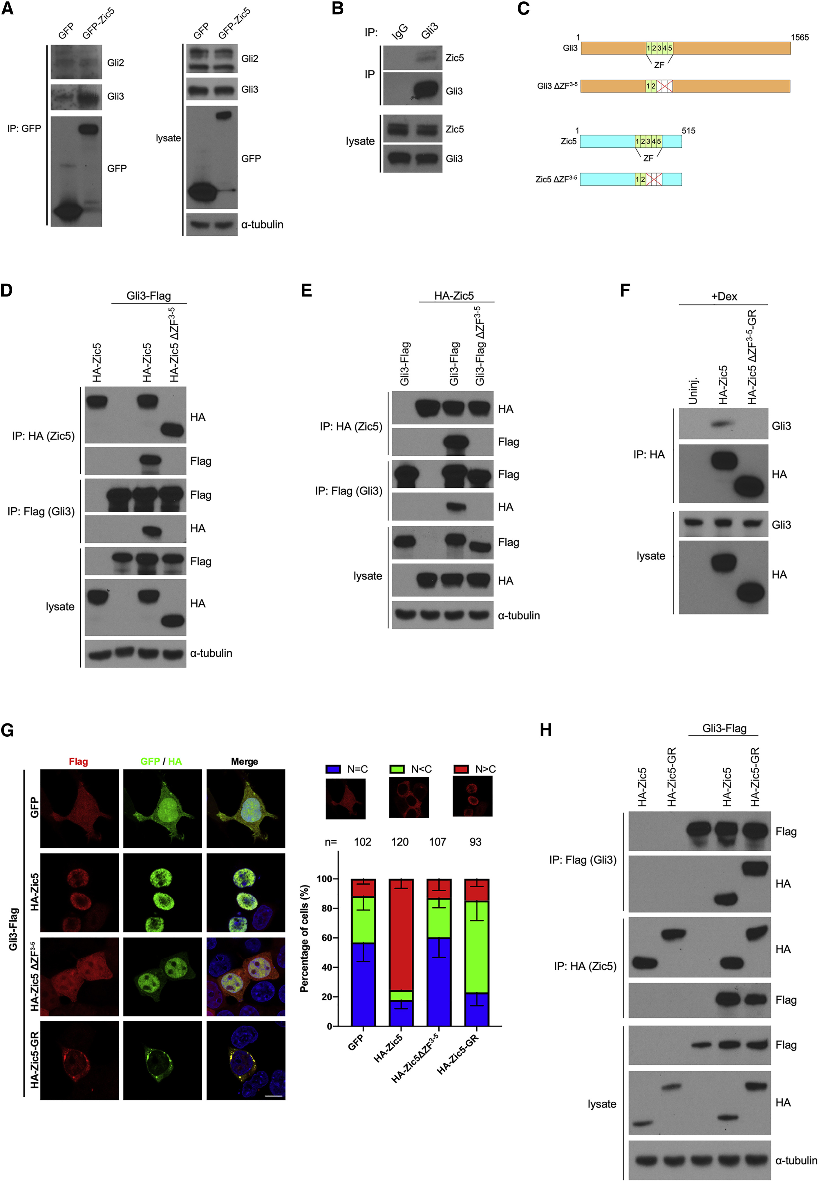 Figure 6. Zic5 interacts with Gli3 (A) GFP or GFP-Zic5 DNA was transfected in HEK293T cells. Co-IP using GFP antibody shows exogenous Zic5 interacts with endogenous Gli3 but not Gli2. (B) Zic5 interacts with Gli3 endogenously in HEK293T cell. (C) Illustration of the 3rdâ5th ZF domains deletion mutants for Zic5 and Gli3. (D and E) Zic5 interacts with Gli3 through the 3rdâ5th ZF domains. (F) Co-IPs using HA antibody on lysates from excised embryo heads injected with indicated RNA shows that Zic5 interacts with endogenous Gli3 through the 3rdâ5th ZF domains. (G) Cell immunofluorescence assays in HEK293T cells stably expressing Gli3-Flag and transfected with indicated plasmids. Histograms represent the percentage of cells with indicated Gli3-Flag subcellular localization. Scale bar, 10 μm. Error bars indicate standard deviation of error. (H) Co-IPs using the indicated antibody on lysates of HEK293T cells transfected with indicated plasmids shows that Zic5-GR interacts with Gli3. |
