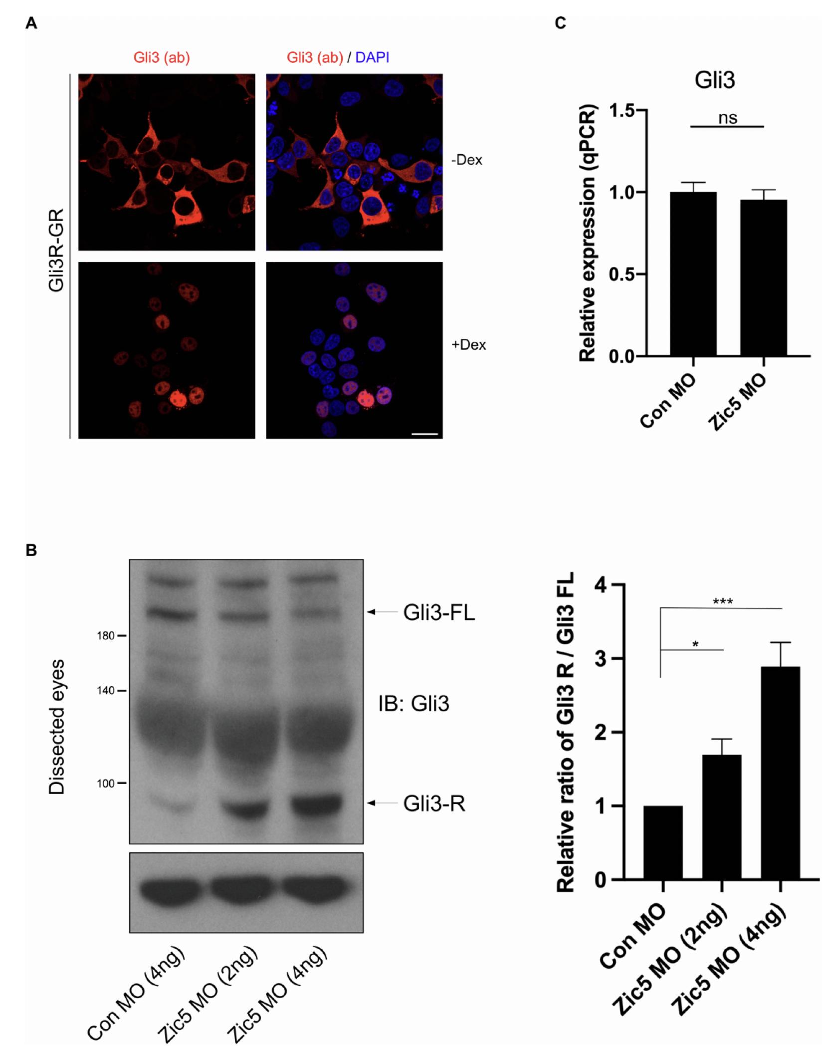 Figure S7. Related to Figure 4. Zic5 knockdown increases ratio Gli3R/Gli3 FL without affecting Gli3 mRNA level in the eye. (A) Validation of Gli3R-GR construct in HEK 293T cells. (B) Different doses of Zic5 MO were injected into D1.1.1 blastomere at 32-cell stage. Approximately, 46 Eyes were dissected at stage 35, lysed and immunoblotted with anti-Gli3 N- terminal antibody. Quantification of relative ratio of Gli3R/Gli3FL of western bolt with one-way ANOVA (Dunnettâs multiple comparisons test), *, P < 0.05, ***, P < 0.001. Histograms represent means ± s.d from three biological repeats. (C) Con MO or Zic5 MO was injected into the D1.1.1 blastomere at 32 -cell stage. 40 eyes per group were then dissected at stage 38 for quantitative PCR analysis. Quantification of normalized fold expression of Gli3 with unpaired t test. Histograms represent means ± s.d. ns: no statistical differences between the groups. |