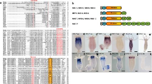 Fig. 2 Sequence features and expression patterns of HyWnt3(+) astacin genes. a Multiple sequence alignment of pro-domain and catalytic domain sequences of astacins identified in this study. For comparison, astacin sequences from diverse species outside the cnidarian phylum were included. Gene ID numbers are as follows: Astacin A. astacus (P07584), NAS-35 C. elegans (P98060), ZHE-1 Danio rerio (Q1LW01), HCE-1 O. latipes (P31580), Meprin α H. sapiens (Q16819), Meprin β H. sapiens (Q16820), SPAN S. purpuratus (P98068), HMP1 (NP_001296695.1), HEA-1 Hydractinia echinata astacin 1 (Q2MCX9), HEA-3 Hydractinia echinata astacin 3 (Q2MCX7), HEA-4 Hydractinia echinate astacin 4 (Q2MCX6), HEA-2 Hydractinia echinata astacin 2 (Q2MCX8), HAS-3 (XP_002166229.3), HAS-6 (XP_002157397.2), HAS-5 (XP_002164800.1), HAS-4 (XP_002162738.1), HAS-2 (XP_002162822.1), HAS-8 (XP_002153855.1), HAS-9 (XP_002161766.1), HAS-1 (XP_012565441.1), HAS-11 (XP_012561076.1), HAS-7 (XP_012560086.1), HAS-10 (XP_002159980.2). In red: the aspartate switch residue in the pro-peptide, the zinc-binding motif, and the Met-turn. Orange background: residues forming the S1 â² sub-site. A red bullet denotes the activation site. b Domain structures of astacins detected in HyWnt3(+) head lysate fractions. S, signal peptide; Pro, pro-domain; ShKT, Stichodactyla toxin domain. câk WISH experiments using antisense and sense oligonucleotide probes (câe) or LNAs (fâk) show a collar-like expression pattern marking a transition zone between head and body column for the majority of astacin genes. Representative of 10 hydras examined. Scale bars: HAS-7, 200âμm; HMP-1, 200âμm; HAS-1, 200âμm; HAS-2, 100âμm; HAS-11, 50âμm; HAS-5, 100âμm; HAS-9, 100âμm; HAS-10, 200âμm, control LNA, 200âμm |
