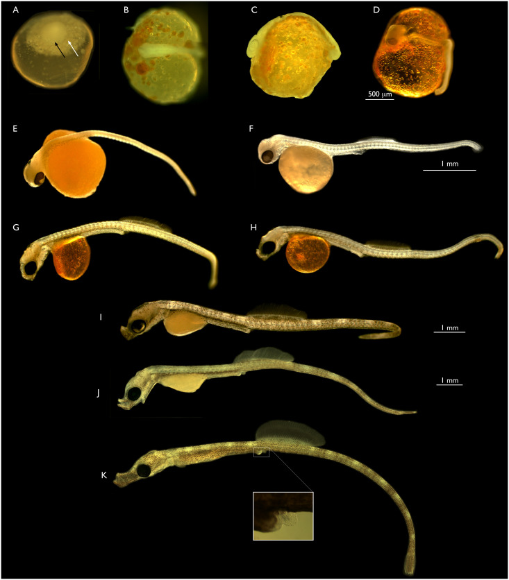 Fig 1. Embryonic development of the bay pipefish.A. Blastula/disc stage. The black arrow indicates the lateral border of the dense disc of cells. The white arrow indicates a larger disc of more dispersed material that the cellular disc sites upon. Approximate equivalent; medaka stage 11–12. B. Early segmentation stage. Anterior end of embryo is to the left. Approximate medaka stage 18–19. C. Late segmentation stage, lateral view. Retina obvious. Approximate medaka stage equivalent is stage 22. D. Early pharyngula stage. Retina obvious, extensive somitogenesis. Posterior tail is not attached to yolk sac. Approximate equivalent; medaka stage 25, except the tail is longer and detached in the pipefish. E. Mid-pharyngula stage. No snout, no fin blastemas. F. Mid pharyngula stage II. Slight protuberance in future snout region (white arrow). Dorsal and caudal fin blastemas present, first dorsal fin rays are emerging, no rays in caudal fin. G. Late pharyngula stage. Future snout small. Dorsal fin rays still forming, first rays in caudal fin are apparent. H. Late pharyngula stage. Future snout small. Dorsal fin rays still forming, first rays in caudal fin are apparent. I. Early hatching stage. Snout distinct, jaw visible and mouth can open. Dorsal and caudal fin rays are well developed. Yolk sac is 50% absorbed. J. Mid hatching stage. Snout becoming longer, tail extending, yolk sac remnant rapidly decreasing in size, approximately 25% of original size. K. Late hatching stage, early fry stage, shortly before emergence. Elongated snout, well developed dorsal fin. Yolk sac has been resorbed. Birth imminent. The panel in K illustrates the anal fin in this embryo under higher magnification. Further details on the developing snout and fins are present in the following figure.