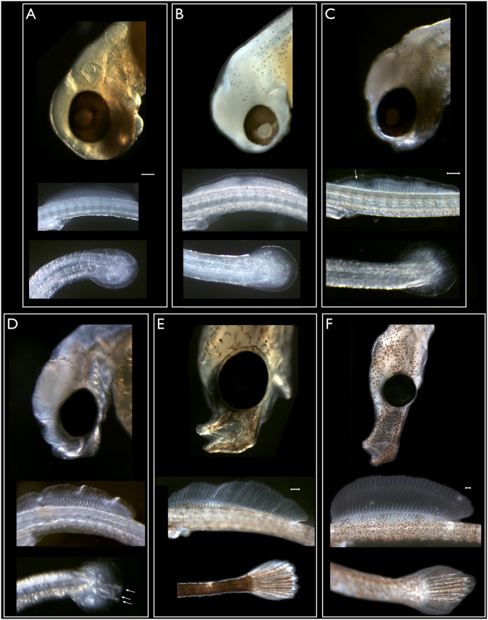 Fig 2. Anatomical features of pharyngula and hatching stage embryos.Scale bars in A, C, E and F represent 100 microns, white arrows indicate fin rays. A. Mid-pharyngula stage, no mouth, dorsal fin and caudal fin blastemas. Otolith visible. B. Similar to A, but slightly older. C. Mid pharyngula stage. Slight protuberance in future mouth region. Dorsal fin rays are emerging, no rays in caudal fin. D. Late pharyngula stage. Future snout small. Dorsal fin rays still forming, first rays in caudal fin are apparent. E. Early hatching stage. Snout distinct, jaw visible and mouth can open. Dorsal and caudal fin rays are well developed. Yolk sac is 50% absorbed. Melanocytes star shaped. F. Late hatching stage, early fry stage, shortly before emergence. Elongated snout, well developed dorsal fin. Yolk sac has been resorbed and birth is imminent.