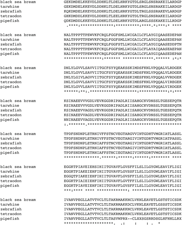 Fig 4. Translated protein sequence of bay pipefish atp1a aligned to related proteins from various fresh and salt water fishes.Amino acid residues conserved in all species are indicated with a ‘*’, highly similar amino acids with a ‘:’ and similar amino acids with a ‘.’. The NCBI accession numbers of aligned proteins are; black sea bream, ABR10300.1, tarwhine, AAT48993.1; zebrafish AAI63629.1; tetraodon, CAF97804.1. The first conserved amino acid of the pipefish protein, the lysine residue (K), corresponds to amino acid 25 of the zebrafish reference protein.