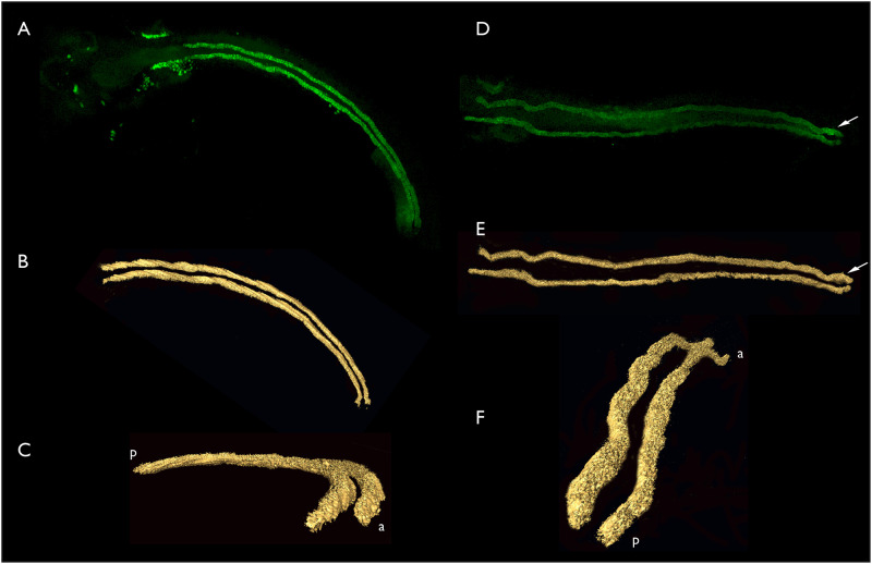 Fig 6. Confocal image stacks and computer generated renderings of aglomerular kidney structure in bay pipefish late pharyngula embryos.A-C, three views of a single set of aglomerular tubules. A. Dorsal view, anterior left, confocal stack. B. AMIRA generated surface model of the data illustrated in panel A. C. The same model as illustrated in panel B rotated so that the anterior portion of the kidney is on the lower right, closest to the viewer. a, anterior; p, posterior. D-F, three views of a single set of aglmoerular tubules. D. Confocal stack. E. AMIRA surface model of the same set of tubules as illustrated in D. F. The model illustrated in E rotated with the posterior end now closest to the viewer. a, anterior; p, posterior. 3D rotations of these models can be viewed in S1–S4 Videos.