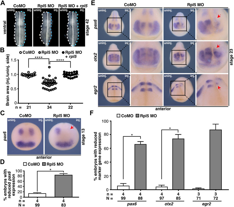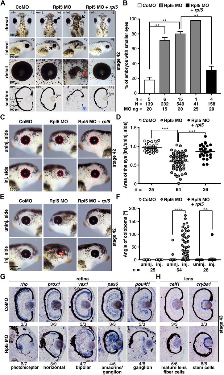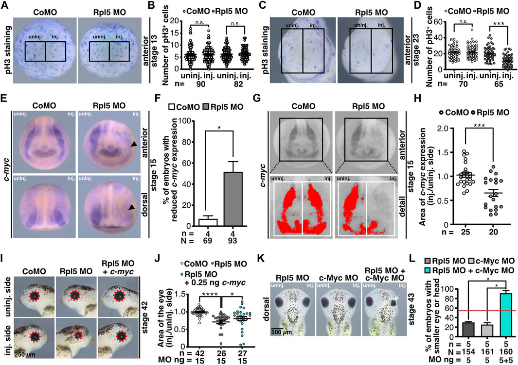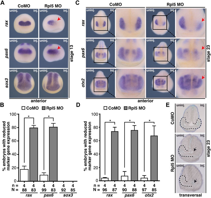 Ribosomal biogenesis is a fundamental process necessary for cell growth and division. Ribosomal protein L5 (Rpl5) is part of the large ribosomal subunit. Mutations in this protein have been associated with the congenital disease Diamond Blackfan anemia (DBA), a so called ribosomopathy. Despite of the ubiquitous need of ribosomes, clinical manifestations of DBA include tissue-specific symptoms, e.g., craniofacial malformations, eye abnormalities, skin pigmentation failure, cardiac defects or liver cirrhosis. Here, we made use of the vertebrate model organism Xenopus laevis and showed a specific expression of rpl5 in the developing anterior tissue correlating with tissues affected in ribosomopathies. Upon Rpl5 knockdown using an antisense-based morpholino oligonucleotide approach, we showed different phenotypes affecting anterior tissue, i.e., defective cranial cartilage, malformed eyes, and microcephaly. Hence, the observed phenotypes in Xenopus laevis resemble the clinical manifestations of DBA. Analyses of the underlying molecular basis revealed that the expression of several marker genes of neural crest, eye, and brain are decreased during induction and differentiation of the respective tissue. Furthermore, Rpl5 knockdown led to decreased cell proliferation and increased cell apoptosis during early embryogenesis. Investigating the molecular mechanisms underlying Rpl5 function revealed a more than additive effect between either loss of function of Rpl5 and loss of function of c-Myc or loss of function of Rpl5 and gain of function of Tp53, suggesting a common signaling pathway of these proteins. The co-injection of the apoptosis blocking molecule Bcl2 resulted in a partial rescue of the eye phenotype, supporting the hypothesis that apoptosis is one main reason for the phenotypes occurring upon Rpl5 knockdown. With this study, we are able to shed more light on the still poorly understood molecular background of ribosomopathies.