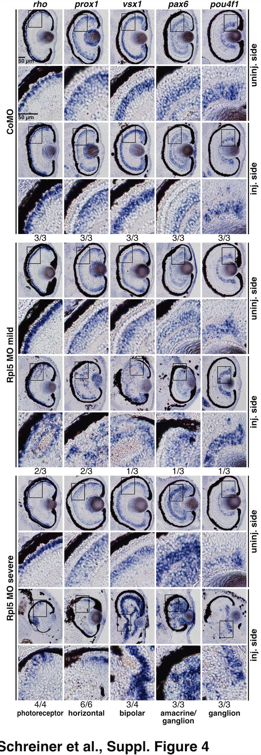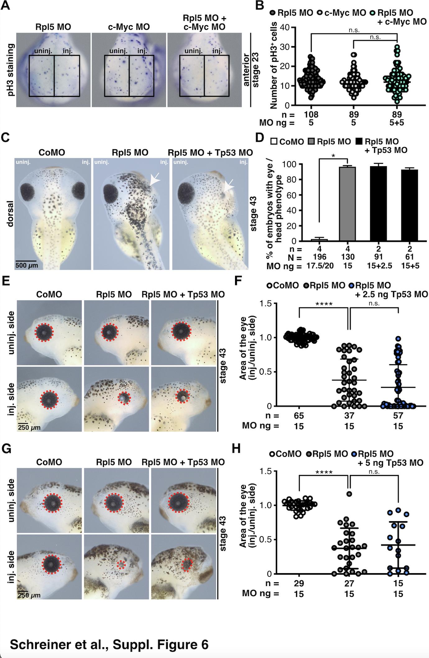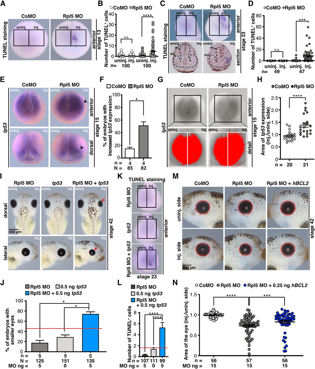 Ribosomal biogenesis is a fundamental process necessary for cell growth and division. Ribosomal protein L5 (Rpl5) is part of the large ribosomal subunit. Mutations in this protein have been associated with the congenital disease Diamond Blackfan anemia (DBA), a so called ribosomopathy. Despite of the ubiquitous need of ribosomes, clinical manifestations of DBA include tissue-specific symptoms, e.g., craniofacial malformations, eye abnormalities, skin pigmentation failure, cardiac defects or liver cirrhosis. Here, we made use of the vertebrate model organism Xenopus laevis and showed a specific expression of rpl5 in the developing anterior tissue correlating with tissues affected in ribosomopathies. Upon Rpl5 knockdown using an antisense-based morpholino oligonucleotide approach, we showed different phenotypes affecting anterior tissue, i.e., defective cranial cartilage, malformed eyes, and microcephaly. Hence, the observed phenotypes in Xenopus laevis resemble the clinical manifestations of DBA. Analyses of the underlying molecular basis revealed that the expression of several marker genes of neural crest, eye, and brain are decreased during induction and differentiation of the respective tissue. Furthermore, Rpl5 knockdown led to decreased cell proliferation and increased cell apoptosis during early embryogenesis. Investigating the molecular mechanisms underlying Rpl5 function revealed a more than additive effect between either loss of function of Rpl5 and loss of function of c-Myc or loss of function of Rpl5 and gain of function of Tp53, suggesting a common signaling pathway of these proteins. The co-injection of the apoptosis blocking molecule Bcl2 resulted in a partial rescue of the eye phenotype, supporting the hypothesis that apoptosis is one main reason for the phenotypes occurring upon Rpl5 knockdown. With this study, we are able to shed more light on the still poorly understood molecular background of ribosomopathies.