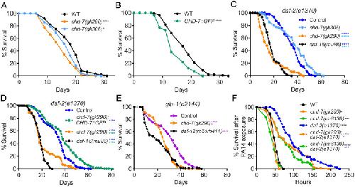 Fig. 2. chd-7 affects longevity and response to pathogen. (A–E) chd-7 promotes longevity in wild-type, daf-2(e1370), and glp-1(e2144) mutants. Mean survival days on OP50-1; survival data analyzed using Kaplan−Meier test. For all experiments, the asterisk in color represents strain of reference for statistical analysis. Details of number of animals and additional data from replicates can be found in SI Appendix, Table S1. (A) WT (18.12), chd-7(gk290) (14.91), chd-7(gk306) (16.53). *P < 0.05 and ****P < 0.0001 compared to the wild-type, N2 strain. (B) WT (17.85), CHD-7::GFP (14.35). ****P < 0.0001 compared to the wild-type, N2 strain. (C) daf-2(e1370) (35.58), chd-7(gk306);daf-2(e1370) (37.18), chd-7(gk290);daf-2(e1370) (17.47), daf-16(mu86);daf-2(e1370) (18.85). ****P < 0.0001. (D) daf-2(e1370) (27.9), chd-7(gk290);daf-2(e1370);CHD-7::GFP (30.84), chd-7(gk290);daf-2(e1370) (19.13), daf-16(mu86);daf-2(e1370) (14.48). ****P < 0.0001. (E) glp-1(e2144) (30.4), chd-7(gk290);glp-1(e2144) (28.37), glp-1(e2144);daf-12(rh61rh411) (25.99). *P < 0.05 and ****P < 0.0001. (F) chd-7 mediates the response against the opportunistic bacteria P. aeruginosa. Mean lifespan in hours (m) ± SEM. n is the number of animals analyzed/total number in experiment. WT (mean = 52.11 ± 0.96, n = 94 of 162), chd-7(gk290) (mean = 47.45 ± 1.05, n = 54 of 130), chd-7(tm6139) (mean = 44.47 ± 1.57, n = 56 of 80), daf-2(e1370) (mean = 105.46 ± 5.61, n = 65 of 115), chd-7(gk290);daf-2(e1370) (mean = 86.74 ± 4.21, n = 103 of 120), and chd-7(tm6139);daf-2(e1370) (mean = 79.13 ± 4.9, n = 50 of 60). *P < 0.05; ***P < 0.001 and ****P < 0.0001. Survival data analyzed using Kaplan−Meier test.