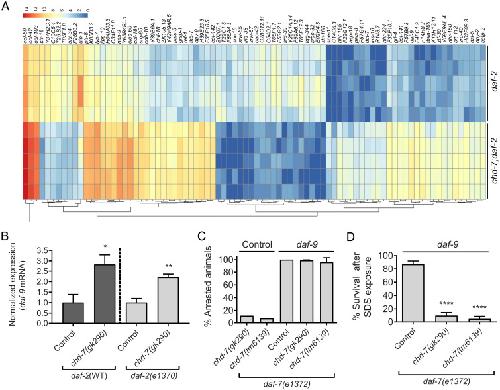 Fig. 4. RNA-seq analysis of transcriptome changes in chd-7(gk290) mutant dauers. (A) Heat map of expression values for the 84 DEGs (cutoff of 0.05 on FDR). DEGs were determined using DESeq2 (v1.20.0). The color scale represents the normalized count values in log2 scale. Hierarchical clustering of the DEGs is represented by dendrograms at bottom. (B) Expression levels of daf-9 mRNA are increased in chd-7(gk290); daf-2(e1370) partial dauers and in L3-like arrested chd-7(gk290) animals upon starvation (Fig. 1G). Error bars indicate SE from three biological repeats. Two-tailed unpaired t test. *P < 0.05 and **P < 0.01. (C) daf-9 knockdown in chd-7;daf-7(e1372) animals rescues dauer arrest at 25 °C. Two to three young L4s were plated on to freshly seeded plates with either daf-9 or Control empty vector RNAi and allowed to lay eggs. After 72 h, the adults were removed and the proportion of progeny that arrested as dauers was calculated. Bars and horizontal black lines represent mean percentage with SD (n > 598 total animals per strain). (D) daf-9 RNAi rescues arrest in chd-7;daf-7(e1372) animals but leads to partial dauers. Arrested animals grown at 25 °C on daf-9 RNAi plates were treated with 1% SDS for 30 min and survival was scored. Bars and horizontal black lines represent mean percentage with SD (n > 159 total animals per strain). One-way ANOVA, ****P < 0.0001, compared to daf-7(e1372).
