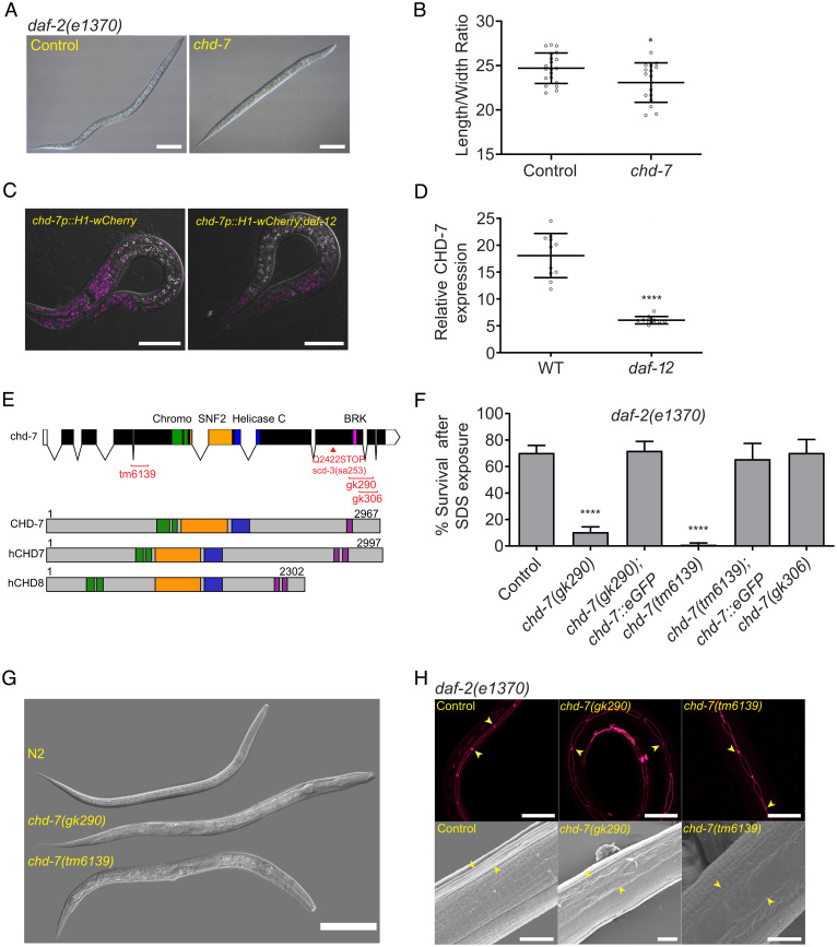 Fig. 1. The DAF-12 regulated target chd-7 is required for proper dauer morphogenesis. (A) chd-7(RNAi) causes a partial dauer phenotype in daf-2(e1370). Representative DIC photomicrographs of normal and partial dauers from daf-2(e1370) exposed to Control (L4440) or chd-7 dsRNA, respectively. (Scale bars: 50 uM.) (B) Quantification of axial ratio of daf-2(e1370);control(RNAi) and daf-2(e1370);chd-7(RNAi) dauers. Three biological replicates were scored (n = 16 to 21 worms per replicate). Horizontal black lines represent mean with SD. Unpaired t test, *P < 0.05. (C) daf-12 regulates chd-7 expression. Representative images of chd-7 transcriptional reporter, chd-7p::H1-wCherry or chd-7p::H1-wCherry;daf-12(rh61rh411) worms at L2/L3 stage. (Scale bars: 20 uM.) (D) Relative expression of the transcriptional reporter (n > 10 per strain). Unpaired t test, ****P < 0.0001. (E) C. elegans chd-7 gene and protein. (Upper) chd-7 genomic region. UTR and exons shown as bars; introns by lines. In red, available chd-7 deletional alleles (data obtained from Caenorhadbitis Genome Center and National Bioresearch Project). (Lower) The predicted protein isoforms of C. elegans CHD-7, human CHD7, and human CHD8. Signature domains in CHD proteins: two N-terminal chromodomains for interaction with a variety of chromatin components (green), a SNF-2 like domain with ATPase activity (yellow), and a helicase domain (blue). The class III subfamily is defined by a BRK domain (purple). (F) chd-7(gk290);daf-2(e1370) and chd-7(tm6139);daf-2(e1370) develop as SDS-sensitive dauer larvae. n > 725 animals per strain tested. Bars and horizontal black lines represent mean percentage with SD. χ2 test with Bonferroni correction for multiple comparisons. ****P < 0.0001. Asterisks represent the comparison to daf-2(e1370). (G) chd-7(gk290) and chd-7(tm6139) prevent dauer development upon starvation of otherwise wild-type worms. Representative DIC photomicrographs of N2 dauers, arrested L3-like chd-7(gk290), and a small chd-7(tm6139) adult. (Scale bar: 100 uM.) (H) chd-7;daf-2 partial dauers fail to develop the dauer alae. (Upper) Representative photomicrographs of daf-2(e1370) dauers or chd-7;daf-2(e1370) partial dauers expressing the ajm-1::GFP reporter to delineate the seam cell borders (arrowheads mark a subset of junctions). (Scale bars: 20 uM.) (Lower) Scanning electron microscopy images of daf-2(e1370) dauers or chd-7;daf-2(e1370) partial dauers (arrowheads mark alae details). (Scale bars: 5uM.)