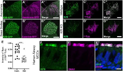 Figure 1. Kif9 localization to motile cilia. (AâAâ³) Kif9âGFP construct localizes to Xenopus multiciliated cells in the axonemes. Kif9âGFP is in green (A), membraneâRFP is in magenta (Aâ²). (BâBâ³) The Kif9âGFP construct localizes to basal bodies of multiciliated cells in Xenopus. Kif9âGFP in green (B), Centrin4âRFP in magenta (Bâ²). (CâCâ³) Kif9 antibody (green) confirms localization to Xenopus axonemes. Kif9 in green (C) and acetylated tubulin (ActTub) in magenta (Câ²). (DâDâ³) Knockdown of Kif9 with 15â ng of MO reduces the level of Kif9 (green) in the cilium. (E) Quantification of Kif9 staining intensity over the intensity of acetylated tubulin in control and MO-injected frogs. (FâFâ³) Kif9 immunostaining in human airway multiciliated cells (MCCs). (F) Kif9 immunostaining (green). (Fâ²) DNAI immunostaining (magenta). (Fâ³) Merge of FâFâ² with DAPI. Images are representative of 30 different cells imaged from three independent experiments with at least 10 different embryos imaged for each replicate. Scale bars: 10â µm. |