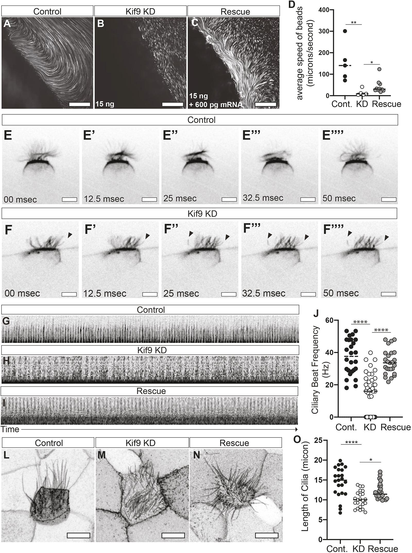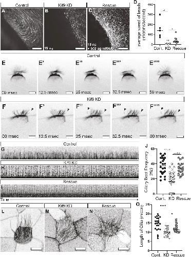 Figure 2. Kif9 is necessary for ciliary beating and ciliary length. (AâC) Still images from bead flow movies subjected to Flowtrace analysis. (A) Control injected, (B) 15â ng Kif9 MO injected (KD), and (C) 15â ng MO with 600â pg Kif9 mRNA (Rescue). A is a still frame of Movie 1, B is a selected still frame from Movie 2, and C is a still frame from Movie 3. Note Movie 3 shows a different flow plane than Movies 1 and 2 hence the different direction of flow in Movie 3, but this was most representative of average flow rescues. Scale bars: 50â µm. (D) Graph of bead velocity averages from collected movies. **P=0.0094 and *P=0.0280 (one-way ANOVA with multiple comparisons and test for normality). (EâFâ³â³) Still frames of ciliary beating in control (EâEâ³â³) and Kif9 KD (FâFâ³â³) multiciliated cells. Arrowheads point to stalled or paralyzed cilia frequently observed in Kif9 KD embryos. Scale bars: 10â µm. (GâI) Representative kymographs of ciliary beating in Control (G), Kif9 KD (H), and Rescue (I) injected embryos. The images represent 15 µm (height) and 10 s (width). (J) Graph of ciliary beat frequency calculated from kymographs of 27 different movies of cilia beating in Hz. (LâN) Representative images of ciliary length marked with membraneâGFP in control (L), Kif9 morpholino (M), and rescue (N) injected embryos. Note: the variability in cilia numbers in these images reflect the normally high variability seen in Xenopus multiciliated cells. Scale bars: 10â µm. (O) Graph of ciliary length from control, morpholino or rescue in µm. ****P<0.0001 and *P=0.0174 (one-way ANOVA with multiple comparisons and test for normality). Images are representative of 30 different cells imaged from three independent replicates with 10 embryos imaged for each replicate. |