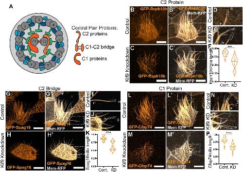 Figure 3. Kif9 contributes to central pair proteins and distal tip compartmentalization. (A) Schematic of 9+2 motile ciliary structure with central pair components schematized by tubule association. (BâCâ²) Confocal images of the localization of the radial spoke head component GFPâRsph10B (orange) in control (B,Bâ²) and Kif9 MO-injected (C,Câ²) embryos. (D,E) Magnified views of cilia from area indicated in Bâ²,Câ² for control (D) and (E) Kif9 KD cilia showing loss of GFPâRsph10B (orange) from the distal ends of cilia. Dotted line outlines lack of protein at distal ends. (F) Quantification of GFPâRsph10B length over total ciliary length in control and Kif9 KD embryos. (GâHâ²) Confocal images of GFPâSpag16 (orange) and membraneâRFP (gray) localization in Xenopus multiciliated cells in control (G,Gâ²) and Kif9 MO (H,Hâ²) injected embryos. (I,J) Magnified views of distal tips of cilia from area indicated in Gâ²,Hâ² for control (I) and Kif9 KD (J) cilia showing loss of GFPâSpag16 (orange) from the distal tip of cilia. Dotted line outlining lack of protein at distal ends. (K) Quantification of GFPâSpag16 length over total ciliary length in control and Kif9 KD injected embryos. (LâMâ²) Confocal images of GFPâCfap74 localization in control (L,Lâ²) and Kif9 MO (M,Mâ²) injected embryos. (NâO) Magnified views of distal tips of cilia from area indicated in Lâ²,Mâ² for control (N) and Kif9 KD (O) cilia showing loss of GFPâCfap74 (orange) from the distal tip of cilia. Dotted line outlining lack of protein at distal ends. (P) Quantification of GFP-Cfap74 length over total ciliary length in Control and Kif9 knockdown embryos. Results in F,K,P are shown as violin plots with the median and quartiles marked by dashed lines. ***P<0.001, ****P<0.0001 (unpaired two-tailed t-test). P, proximal; D, distal. Scale bars: 10â µm. |