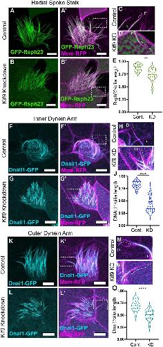 Figure 4. Kif9 is necessary for radial spoke, inner dynein arm and outer dynein arm placement in the distal ends of cilia. (AâBâ²) Confocal images of radial spoke stalk component GFPâRsph23 (green) localization in control (A,Aâ²) and Kif9 MO (B,Bâ²) injected embryos. (C,D) Magnified views of cilia from area indicated in Aâ²,Bâ² for control (C) and Kif9 KD (D) cilia showing loss of GFPâRsph23 from the distal ends of cilia. Dotted line outlining lack of protein at distal ends. (E) Quantification of GFPâRsph23 length over total ciliary length in control and Kif9 KD embryos. (FâGâ²) Confocal images of inner dynein arm Dnali1âGFP localization in control (F,Fâ²) and Kif9 MO (G,Gâ²) injected embryos. (H,I) Magnified views of cilia from area indicated in Fâ²,Gâ² for control (H) and Kif9 KD (I) cilia showing loss of Dnali1âGFP from the distal ends of cilia. Dotted line outlining lack of protein at distal ends. (J) Quantification of GFPâDnai1 length over total ciliary length in control and Kif9 KD embryos. (KâLâ²) Confocal images of outer dynein arm GFPâDnai1 (cyan) localization in control (K,Kâ²) and Kif9 MO (L,Lâ²) injected embryos. (M,N) Magnified views of cilia from area indicated in Kâ²,Lâ² for control (M) and Kif9 KD (N) cilia showing loss of GFPâDnai1 (cyan) from the distal ends of cilia. Dotted line outlining lack of protein at distal ends. (O) Quantification of GFPâDnai1 length over total ciliary length in control and Kif9 KD embryos. Results in E,J,O are shown as violin plots with the median and quartiles marked by dashed lines. **P<0.01, ****P<0.0001 (unpaired two-tailed t-test). P, proximal; D, distal. Scale bars: 10â µm. |