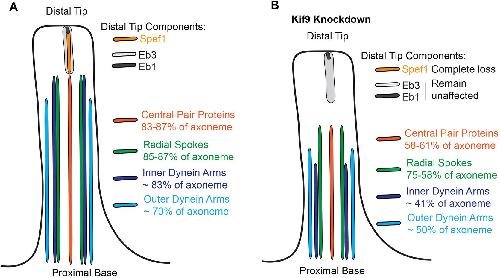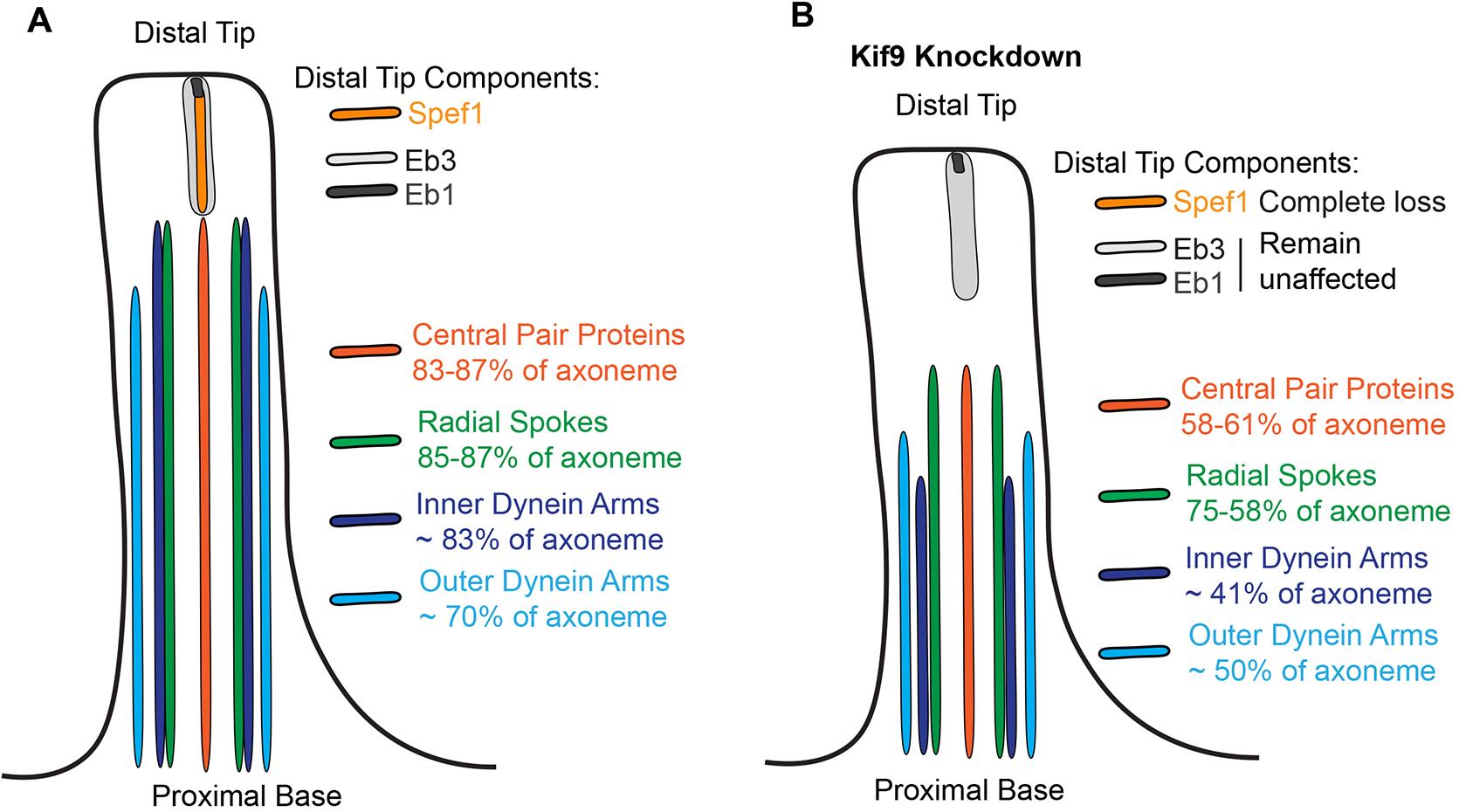 Figure 8. Summary of effect of Kif9 knockdown on proximal to distal patterning of the motile cilium. (A) Schematic of wild-type motile cilia in Xenopus with domains schematized based off findings presented here. (B) Schematic of Kif9 KD cilia and changes to domains observed. |