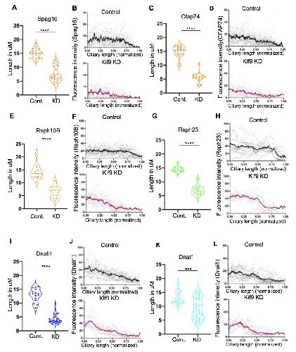 Fig. S2. A. Raw quantification of C2 bridge central pair component GFP-Spag16 length in Control and Morpholino injected embryos. B. Graphs of fluorescence intensity of GFP-Spag16 across the length of the cilia, normalized to 1. C. Raw quantification of C1 central pair component GFP-Cfap74 length in Control and Morpholino injected embryos. D. Graphs of fluorescence intensity of GFP-Cfap74 across the length of the cilia, normalized to 1. E. Raw quantification of GFP-Rsph10B length in Control and Morpholino injected embryos. F. Graphs of fluorescence intensity of GFP-Rsph10B across the length of the cilia, normalized to 1. G. Raw quantification of radial spoke stalk component Rsph23 length in Control and Morpholino injected embryos. H. Graphs of fluorescence intensity of GFP-Rsph23 across the length of the cilia, normalized to 1. I. Raw quantification of inner dynein arm GFP-Dnali1 length in Control and Morpholino injected embryos. J. Graphs of fluorescence intensity of GFP-Dnali1 across the length of the cilia, normalized to 1. K. Raw quantification of outer dynein arm GFP-Dnai1 length in Control and Morpholino injected embryos. L. Graphs of fluorescence intensity of GFP-Dnai1 across the length of the cilia, normalized to 1. |