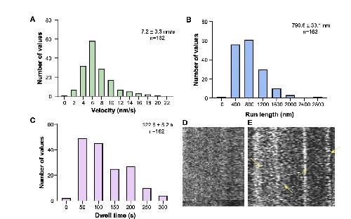 Fig. S3. A. Histogram of speed of truncated Kif9 movement along microtubules in vitro. Values binned to 1 nanometer/ second. X-axis = velocity of molecules in nm/sec. Y-value = number of molecules at given speed. B. Histogram of run length of truncated Kif9 (X-axis) movement and number of molecules tracked (Y-axis). C. Dwell time of paused molecules (X-axis) and number of molecules tracked (Y-axis). Kymograph of live imaging of Kif9-GFP in axonemes. C. Kymograph of live imaging of Kif9-GFP in axonemes, arrows pointing to bidirectional trafficking of Kif9-GFP along the axoneme. |